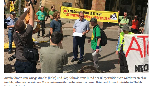 SWR am 22.8.2022: In der Politik wird darüber nachgedacht, Kernkraftwerke später abzuschalten. Das führt in BW zu Protesten. Nun sind Aktivistinnen und Aktivisten vor das Umweltministerium gezogen. »