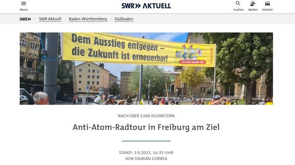SWR am 3.9.2022: Insgesamt sechs Wochen sind Tausende Radler durch Deutschland gefahren, um gegen Atomenergie zu demonstrieren. Am Samstag endete die Tour in Freiburg mit einer Kundgebung. »