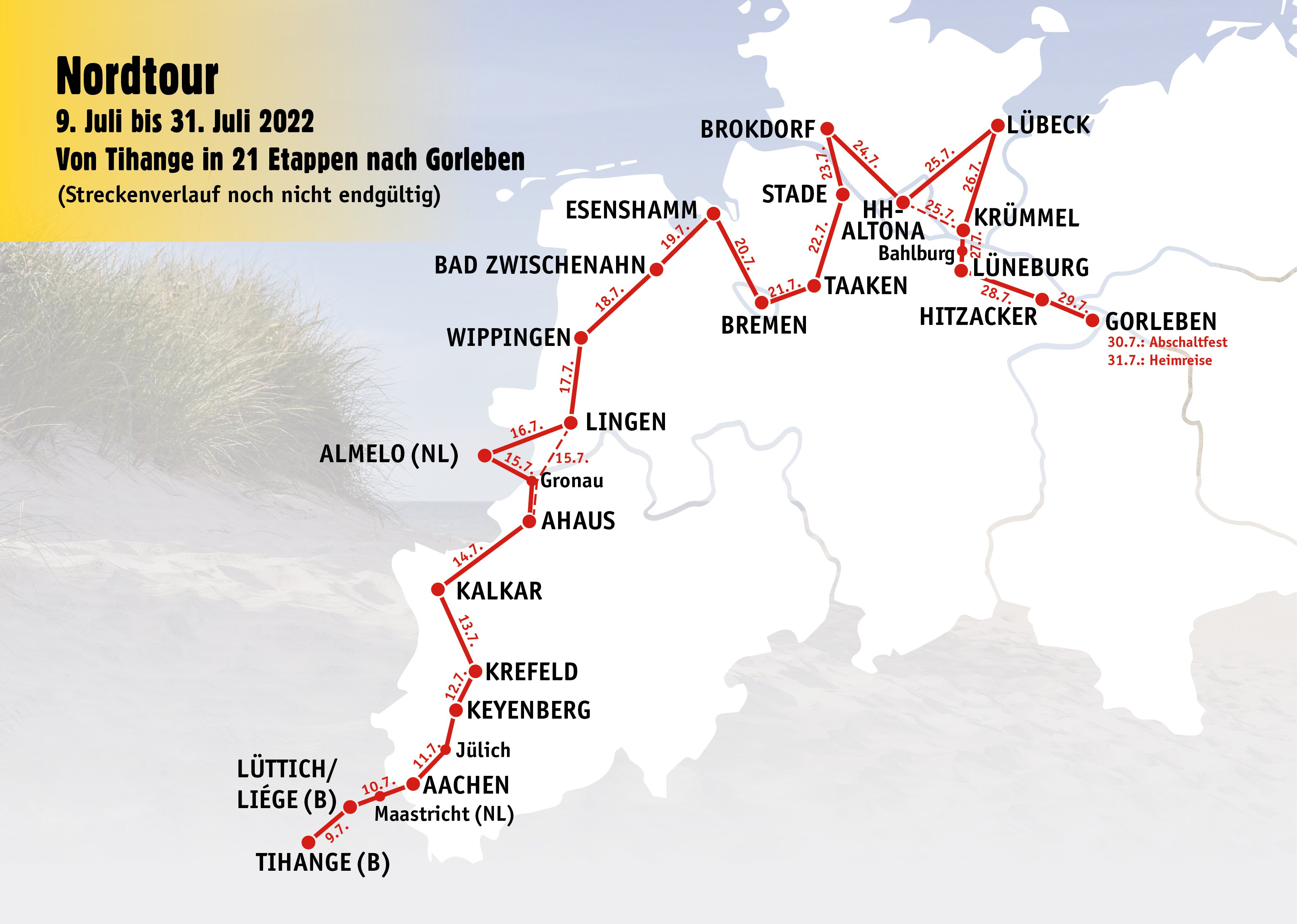 Lützerath/Keyenberg (11.07 ) - Krefeld (12.07) - Kalkar (13.07) - Ahaus (14.07) - Gronau (14.07) - Almelo (NL) (15.07) - Lingen (16.07) - Wippingen (17.07) - Bad Zwischenahn (18.07) - Esenshamm / Brake (19.07) - Bremen (20.07) - Taaken (21.07) - Stade (22.07) - Brokdorf (23.07) - Hamburg-Altona (24.07) - Lübeck (25.07) - Krümmel (26.07) - Lüneburg (27.07) - Hitzacker (28.07) - Gorleben (29.07) - Abschaltfest Gorleben (30.07)