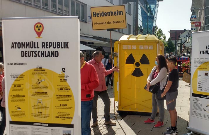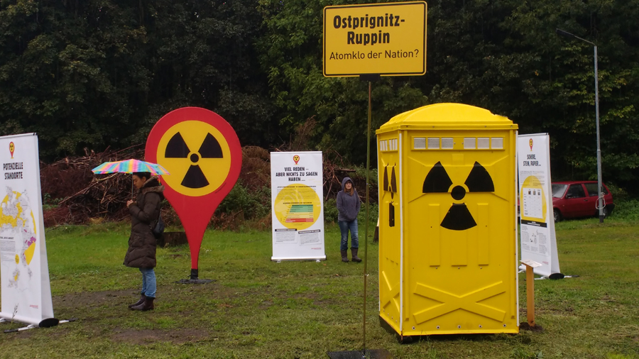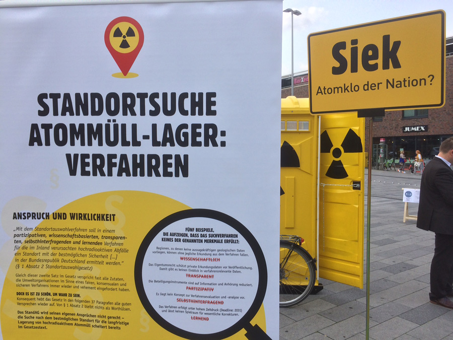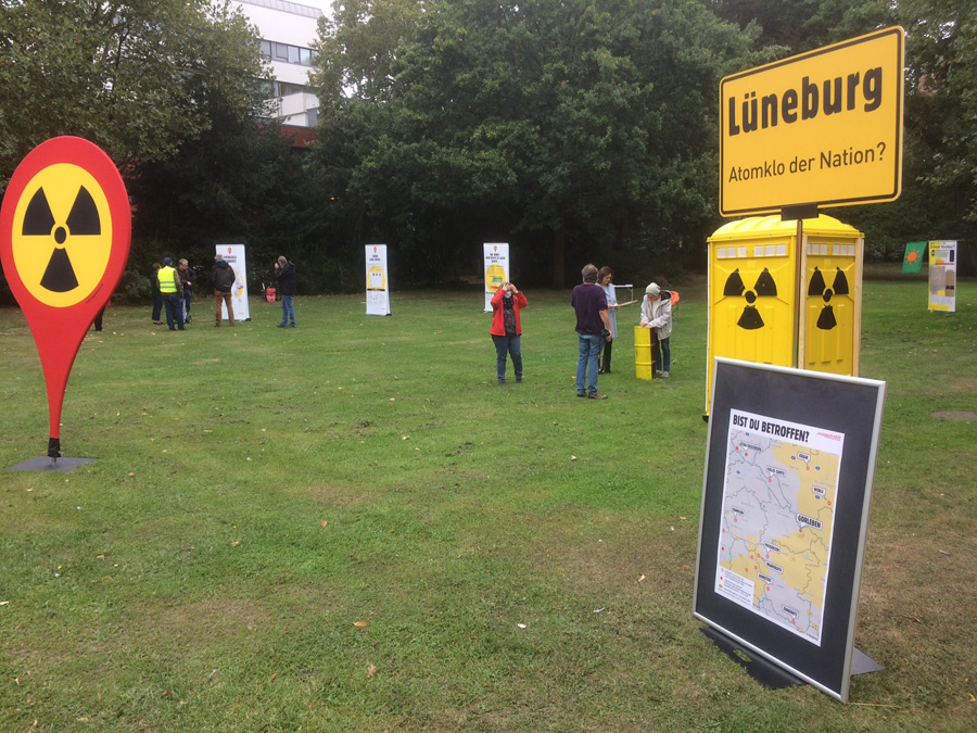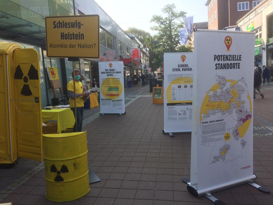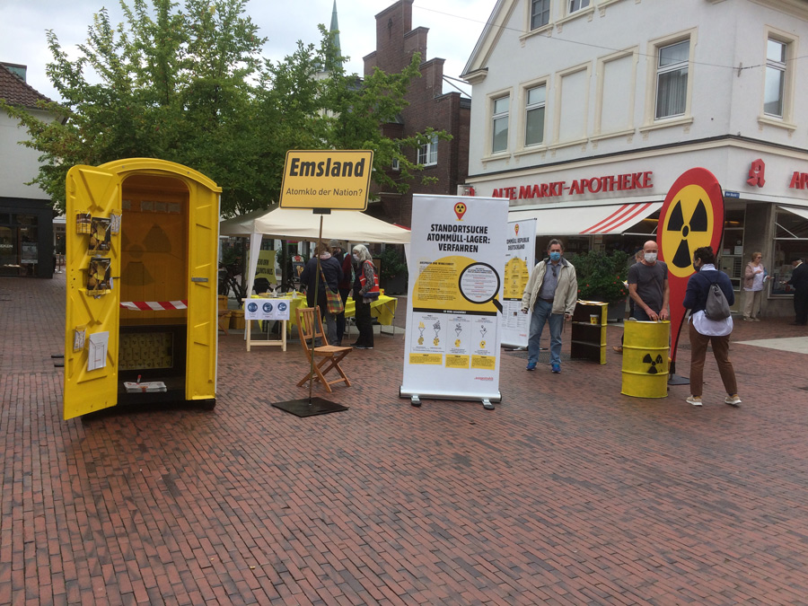 Stell Dir vor, in Deiner Stadt steht auf dem Markplatz oder in der Fußgänger*innen-Zone ein zum „Atomklo“ umgebautes Dixi-Klo, das auf die Standortsuche aufmerksam macht. Dazu kommt eine wetterfeste Ausstellung zum Thema und viel Infomaterial. .ausgestrahlt plant in den Sommermonaten 2021 eine Tour durch die Republik, um in potenziell betroffenen Regionen auf das Thema aufmerksam zu machen.