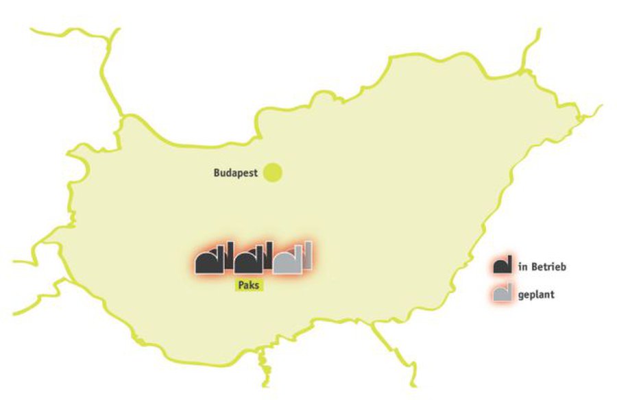 Nur einen einzigen AKW-Standort gibt es in Ungarn: Paks, etwa 100 Kilometer südlich von Budapest. Hier stehen vier alte, gefährliche Reaktoren aus der Sowjet-Ära vom Typ WWER 440/213 – derselbe wie die Blöcke 5 und 6 des AKW Greifswald, die im Zuge der Wiedervereinigung stillgelegt wurden. Die Meiler in Paks sind zwischen 1982 und 1987 in Betrieb gegangen, vorgesehen war eine Laufzeit von 30 Jahren. Für Block 1 und 2 ist diese bereits um 20 Jahre verlängert worden, für Block 3 und 4 läuft das Verfahren noch. Parallel dazu gibt es Pläne für den Neubau von zwei weiteren russischen Reaktoren am selben Standort.