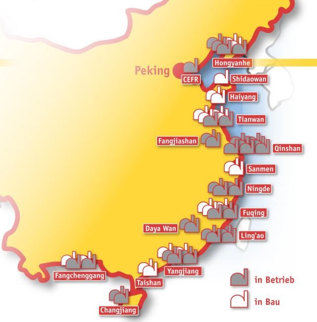 Derzeit deckt China mit seinen 37 Reaktoren dreieinhalb Prozent seines Strombedarfs. In den nächsten drei Jahren soll der Wert auf sechs Prozent steigen, wenn nach und nach 20 neue Reaktoren ans Netz gehen. Bis 2020 will China so 57 Reaktorblöcke betreiben. In den kommenden 50 Jahren sollen dem Langfristplan zufolge sogar rund hundert neue AKW entstehen.