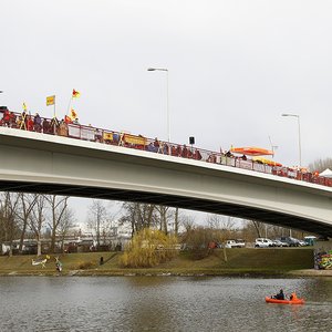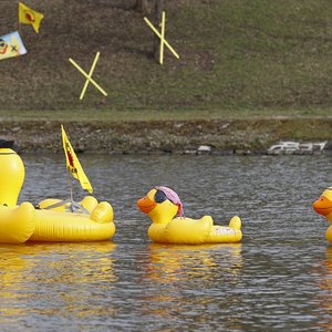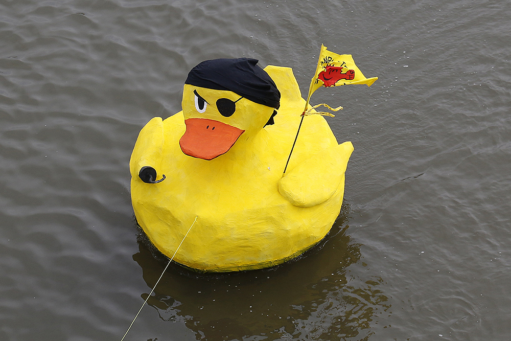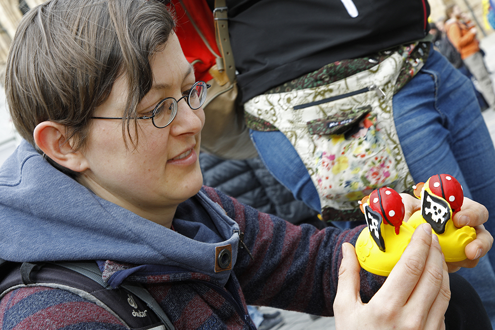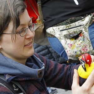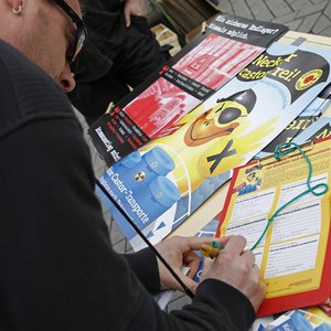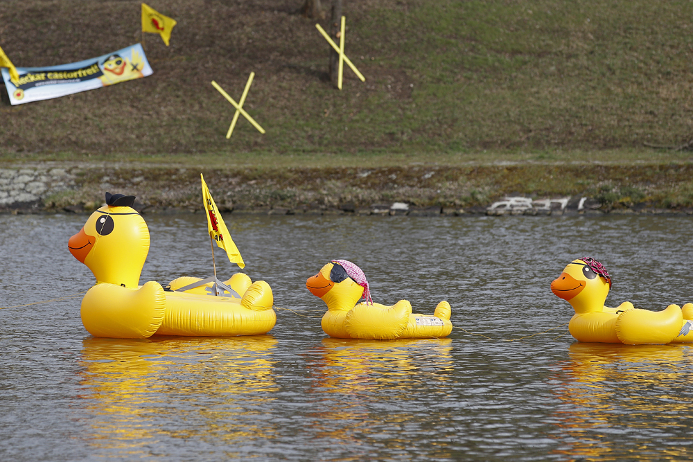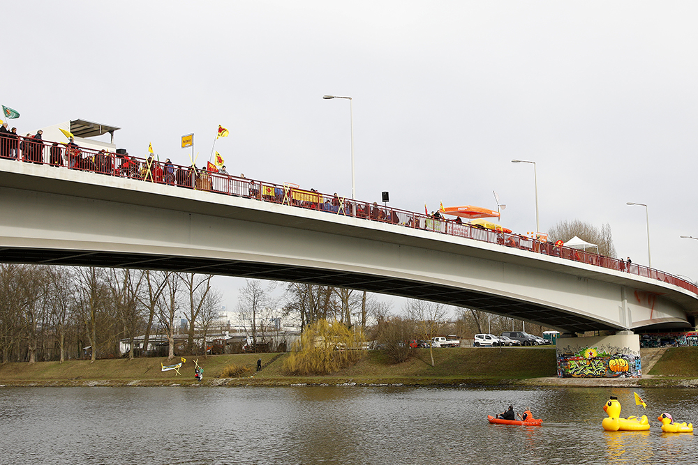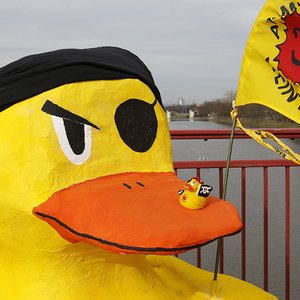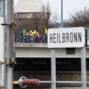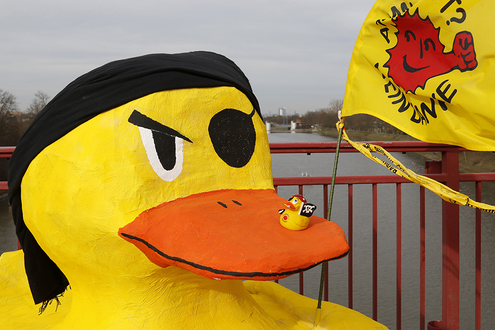 Die Demonstration zog entlang des Neckar-Kanals und der Schleuse Heilbronn, um den geplanten Weg der Transporte mitten durch die Großstadt nachzuverfolgen. Unübersehbar war bei der Demo die kämpferische Ente, Symbol für den Widerstand am und auf dem Neckar.