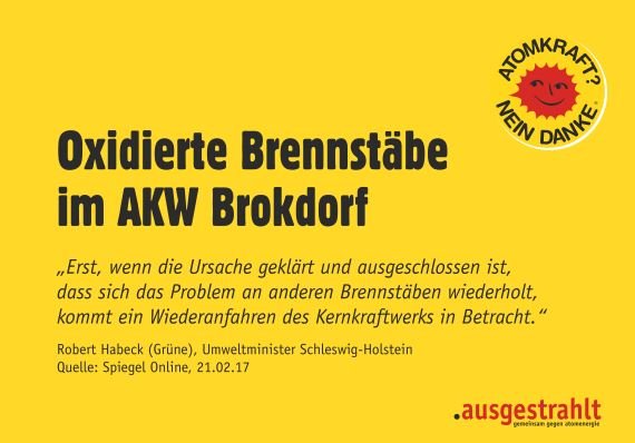 Das für die Atomaufsicht in Schleswig-Holstein zuständige Umweltministerium hat die Bundesatomaufsicht über die Situation im AKW Brokdorf informiert. Aufgrund der ungeklärten Brennstabkorrosion liegt der Reaktor, der eigentlich nur bis zum 24. Februar 2017 in Revision sein sollte, bis heute still. Die Atomaufsicht hat den Brennelementehersteller sowie Sachverständige zur Klärung der Vorgänge im Reaktorkern hinzugezogen. „Für die Zukunft muss ausgeschlossen sein, dass sich erneut Oxidschichten bilden, die den Grenzwert überschreiten. Dafür ist ein Verständnis von den Ursachen der Oxidation erforderlich“, sagte der Leiter der Atomaufsicht in Kiel, Jan Backmann. Umweltminister Habeck schloss ein Wiederanfahren des Atomkraftwerks ohne eindeutige Untersuchungsergebnisse aus: „Erst, wenn die Ursache geklärt und ausgeschlossen ist, dass sich das Problem an anderen Brennstäben wiederholt, kommt ein Wiederanfahren des Kernkraftwerks in Betracht.“