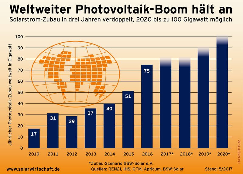 Der aktuellste Bericht über die weltweite Entwicklung der Erneuerbaren Energien, der „Renewables 2017 Global Status Report“, stellt darüber hinaus das rasante und für viele vor Jahren nie für möglich gehaltene weltweite Wachstum der Erneuerbaren Energien heraus. So stieg die neu installierte Leistung um neun Prozent gegenüber 2015 auf 161 Gigawatt - ein Rekordzubau.