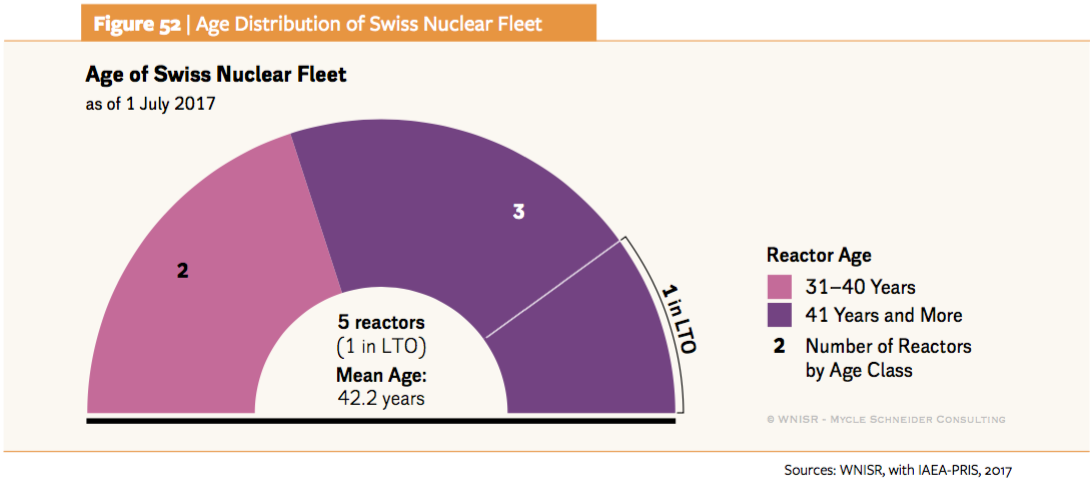 Während der weltweite Durchschnitt aller in Betrieb befindlichen Atomkraftwerke bei 29,3 Jahren liegt, der in der EU bei 32,4 Jahren, ist die Schweiz mit deutlich mehr als 40 Jahren Laufzeit Schlusslicht. Das zeigt der jährlich erscheinende, kritische „World Nuclear Industry Status Report“.