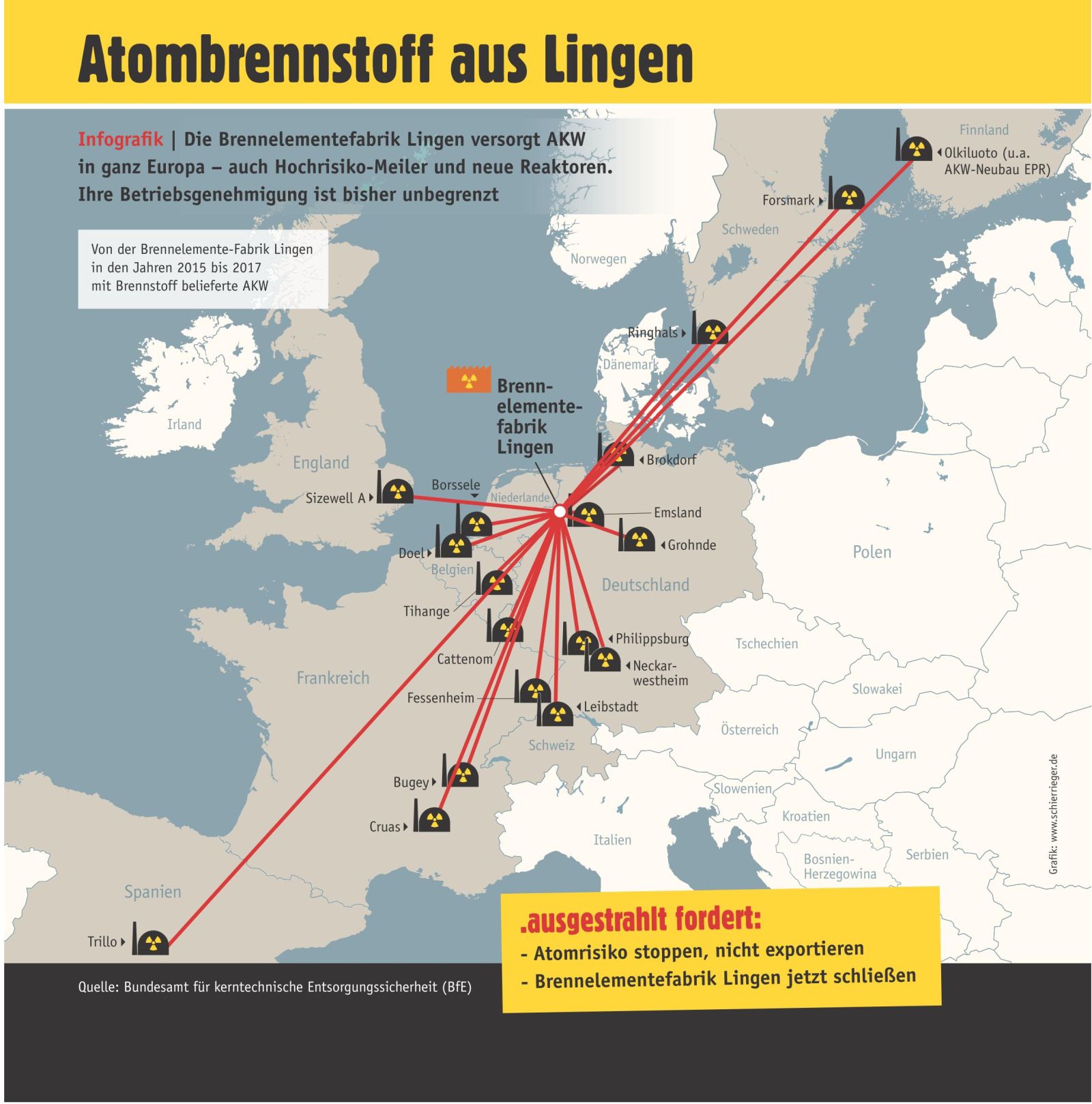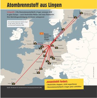 Was die öffentlich viel diskutierten Brennstofflieferungen aus der Brennelementefabrik Lingen angeht, die unter anderem auch die grenznahen Hochrisiko-Reaktoren in Doel, Tihange, Cattenom und Fessenheim beliefert (siehe Grafik), enthält der schwarz-rote Koalitionsvertrag zwar die Absichtserklärung, dass man eben dies „verhindern“ wolle. Konkret will die Regierung aber lediglich „prüfen, auf welchem Wege wir dieses Ziel rechtssicher erreichen“. Das ist umso enttäuschender, als ein Gutachten, welches eben diese rechtssichere Möglichkeit aufzeigt, bereits seit Monaten vorliegt.