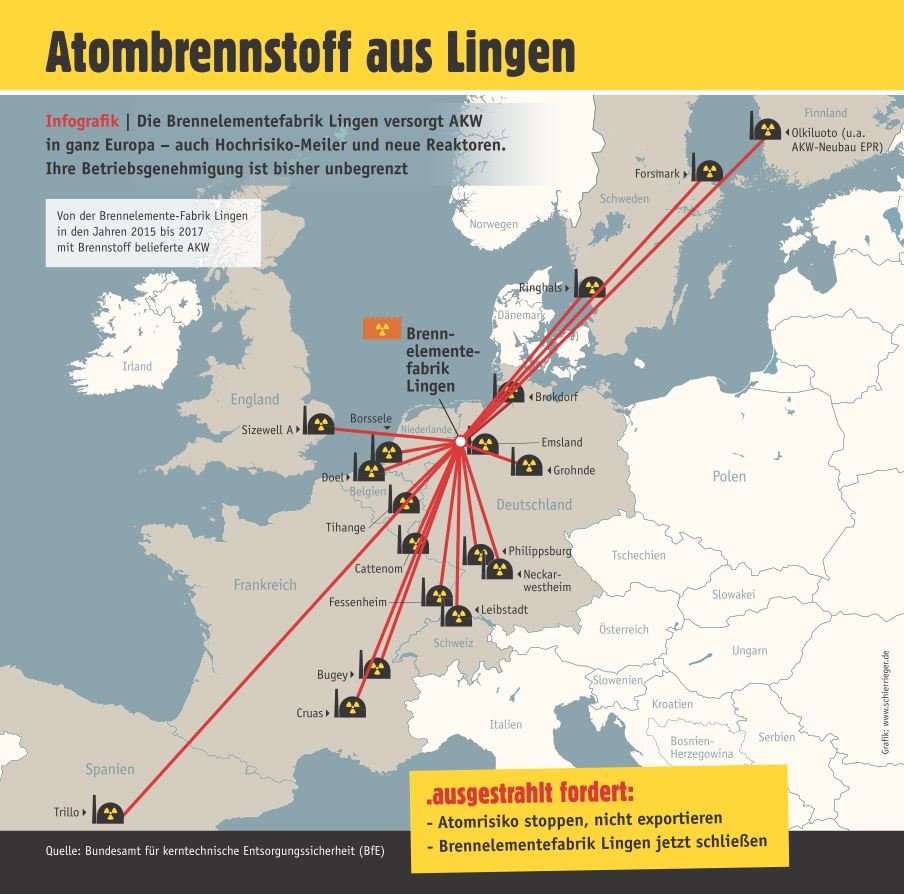 Laut einer Antwort des Bundesumweltministeriums auf eine Anfrage der Grünen-Bundestagsabgeordneten Sylvia Kotting-Uhl wurden insgesamt sechs Transporte von der Brennelemente-Fabrik zu Anlagen in Frankreich und Belgien genehmigt. Drei Mal wurden die besonders umstrittenen belgischen AKW Tihange und Doel beliefert. Zugleich macht sich nun die neue Bundesumweltministerin Svenja Schulze (SPD) u.a. gegen eine Laufzeitverlängerung für das französische AKW Cattenom stark. Ein Widerspruch, meinen Kritiker*innen und fordern den sofortigen Lieferstopp von Brennelementen aus Deutschland - natürlich nicht nur an die Pannenmeiler, sondern generell an alle AKW. Das würde den Abschalt-Druck auf die schon heute unwirtschaftlichen Anlagen erhöhen, wenn sich die Betreiber nach teureren Brennstoff-Alternativen umnschauen müssten.