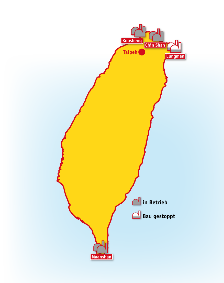 Schon in den 1990er-Jahren gab es zahlreiche Proteste, die in den Jahren nach Fukushima wieder aufflackerten. Damals fiel auch die Entscheidung, das AKW Lungmen vorerst nicht anzufahren. Der staatliche Energieversorger und AKW-Betreiber Taipower, der 20 Jahre an der Anlage gebaut und sie mit Gerichtsverfahren und Lobby-Kampagnen durchgesetzt hatte, fürchtete daher nichts so sehr wie einen Wahlsieg Tsais. Das Unternehmen hat nun siebeneinhalb Milliarden Euro in ein neues Kraftwerk investiert, das nie Strom herstellen wird.