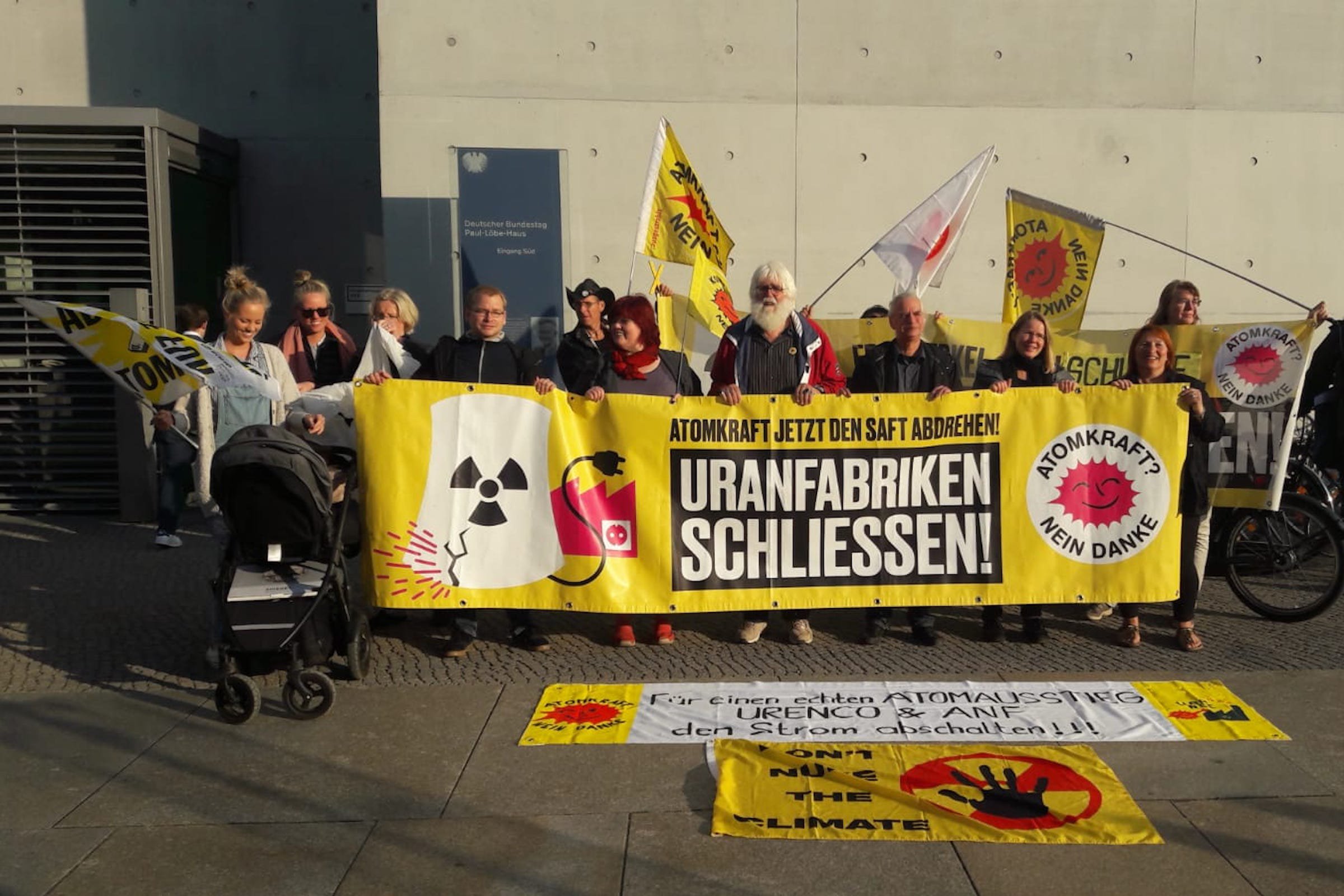 Mit einer Mahnwache begleiteten Anti-Atom-Aktivist*innen eine Anhörung im Umweltausschuss des Bundestages zur Zukunft der Uranfabriken in Gronau und Lingen.