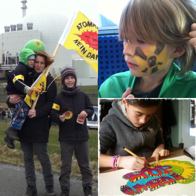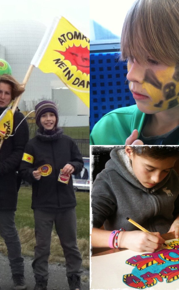 Lennys Mutter Karen ist politisch sehr aktiv; sie setzt sich vor allem für den Umwelt- und Tierschutz ein. Ihr Engagement gegen Atomkraft hat zu der Zeit begonnen, als sie Mutter wurde. „Ich habe drei Kinder und die Zukunft strahlt. Das kann nicht sein“ , hat sie damals gedacht und war fortan auf Anti-Atom-Demos unterwegs oder hat bei Aktionen gegen Atomkraft mitgemacht. Ihre Kinder waren immer dabei – außer bei den Gleisblockaden in Gorleben. Lenny ist der Älteste von drei Jungs. Die Anti-Atom-Demos bedeuten für Lenny ein gutes Stück Kindheitsgeschichte. „Klar, da wurde ich erst mal mitgeschleppt. Und manchmal war das auch echt nervig und anstrengend. Wir mussten immer viel laufen.“ Zwei Stunden von der Bahn zum Atomkraftwerk und wieder zurück, da hätte er oft lieber zu Hause mit seinen Freunden zusammengesessen und Sammelbilder getauscht, erinnert er sich. „Aber dann hat es auch wieder Spaß gemacht. Wir haben uns geschminkt und Plakate gemacht.“ Damit keines der Kinder verlorenging, gab es die Handy-Nummer der Mutter auf den Arm. „Bei den Demos haben wir Kinder immer „Abschalten“ gerufen und unsere Fahnen mit der Anti-Atom-Sonne geschwenkt.“ Es seien immer viele Kinder dabei gewesen und Aktionen für die jungen Demonstrant*innen wurden auch angeboten. „Alle waren nett und die Stimmung war gut. Diese Zeit und diese Erlebnisse haben mich geprägt. Ich finde es gut, dass wir schon so früh mitgegangen sind.“, sagt er.