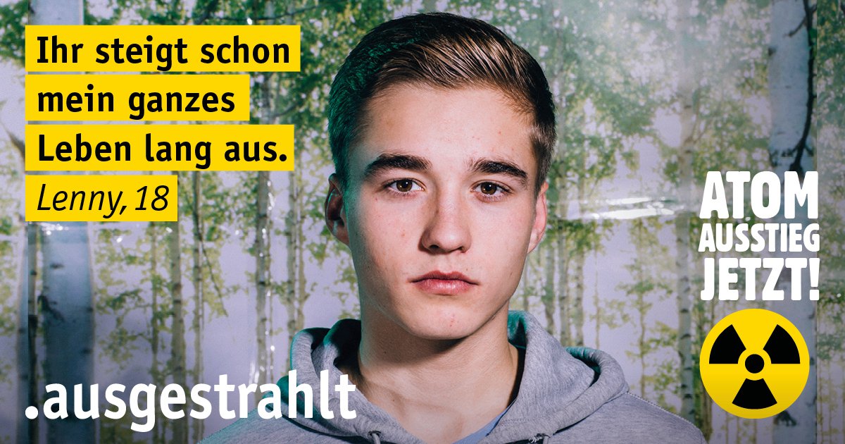 Lenny ist eines der Gesichter auf den Postkarten und Plakaten der „Atomausstieg Jetzt!“-Aktion von .ausgestrahlt. Dass der 18-Jährige mitgemacht hat, ist kein Zufall. Denn die Anti-Atom-Sonne hat seine Kindheit begleitet.