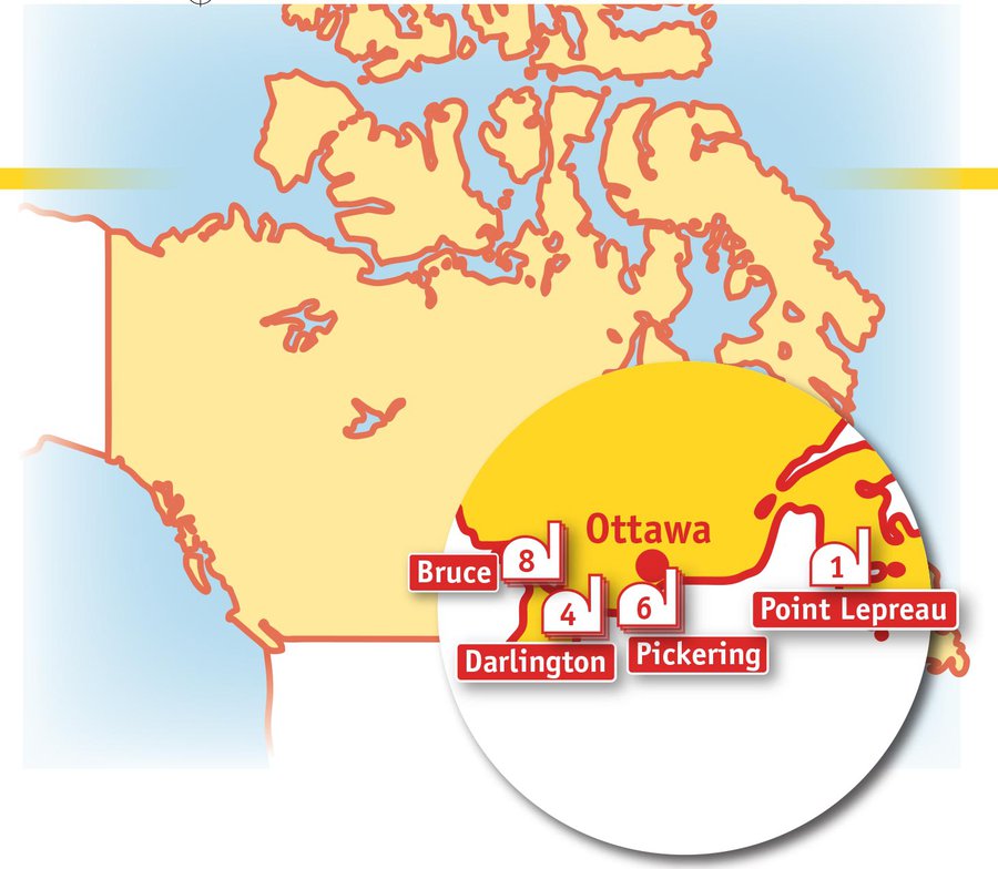 Reaktoren. Diese nutzen Natururan, benötigen also keine Urananreicherung, und erlauben es relativ einfach, Waffenplutonium zu gewinnen. Sie wurden auch nach Indien, Pakistan und Taiwan exportiert. 1978 liefen in Kanada 16 Reaktoren, der allergrößte Teil davon in der Provinz Ontario, acht weitere waren in Bau oder in Auftrag gegeben. Geplant waren noch viel mehr, bestellt aber wurde nach 1978 keiner mehr. Heute liefern noch 19 Reaktoren zusammen ein Siebtel des Stroms.