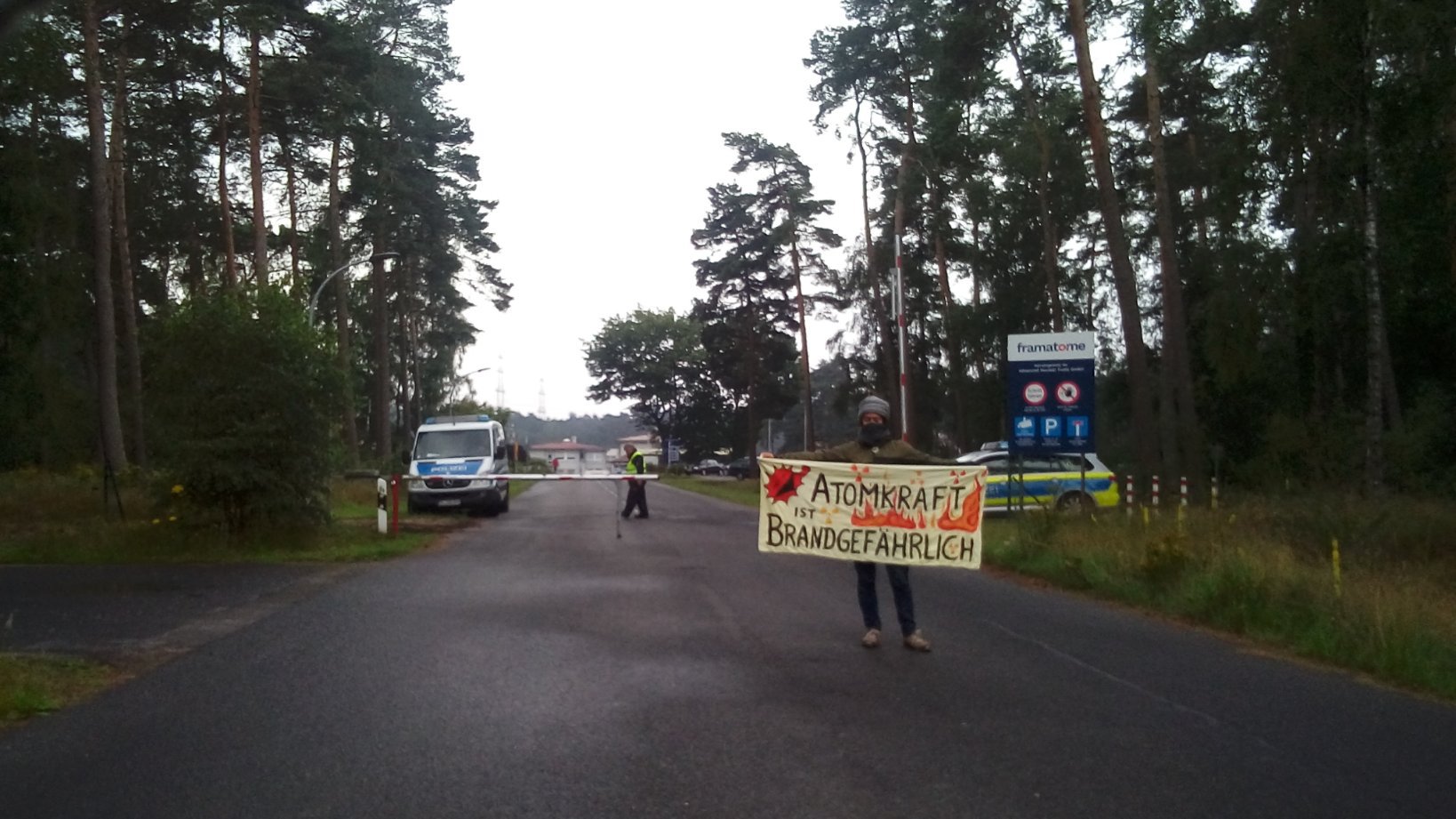 Anders als in einem Atomkraftwerk kann es in einer Brennelementfabrik nicht zu einem Super-GAU kommen, der ganze Landstriche verseucht. Dennoch bedeutet das Hantieren mit Kernbrennstoffen immer auch Risiko. „Atomkraft ist brandgefährlich“ stand auf dem Transparent, mit dem eine Handvoll Atomkraftgegner*innen am Donnerstagmorgen die Einfahrt der Brennelementfabrik Lingen kurzzeitig blockierten. Sie erinnern damit an den wohl schwersten Störfall seit vielen Jahren, der sich Ende 2018 in der Anlage ereignete. In einem Labor kam es zu einer Explosion. Uran wurde freigesetzt – konnte aber „nicht wiedergefunden werden“. Nach dem Brand folgten Erklärungsversuche des französischen Betreibers, nur häppchenweise kamen Informationen an die Öffentlichkeit. Wegen „möglicher Verunreinigung und unerlaubten Umgangs mit radioaktiven Stoffen“ zeigten Atomkraftgegner*innen den Betreiber der Brennelementfabrik daraufhin an.