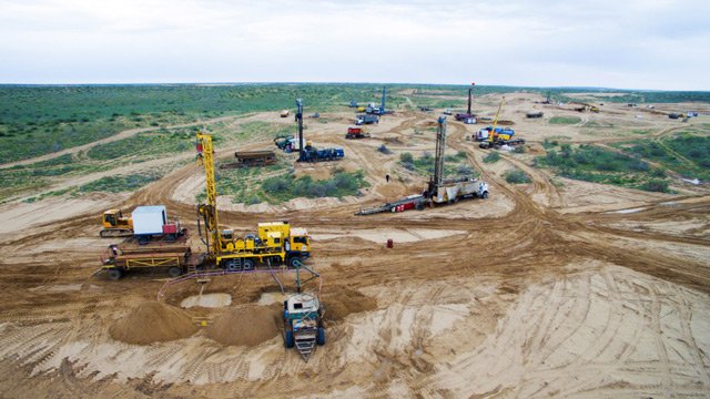 Uran wird in Kasachstan seit den 1950er Jahren abgebaut. Vier Produktionszentren förderten bis zum Zusammenbruch der Sowjet- union rund 70.000 Tonnen – unter strenger Geheimhaltung und ausschließlich unter Tage oder im offenen Tagebau. Der 1997 gegründete Staatskonzern Kazatomprom setzt demgegenüber heute nur noch auf das sogenannte In-Situ-Leach-Verfahren (ISL). Dabei werden über Injektionsbohrungen verdünnte Schwefelsäure, Wasserstoffperoxid oder Ammoniumcarbonat in uranhaltige Schichten gepresst und über eine zweite Bohrung die dadurch gewonnene uranhaltige Lösung an die Oberfläche befördert.