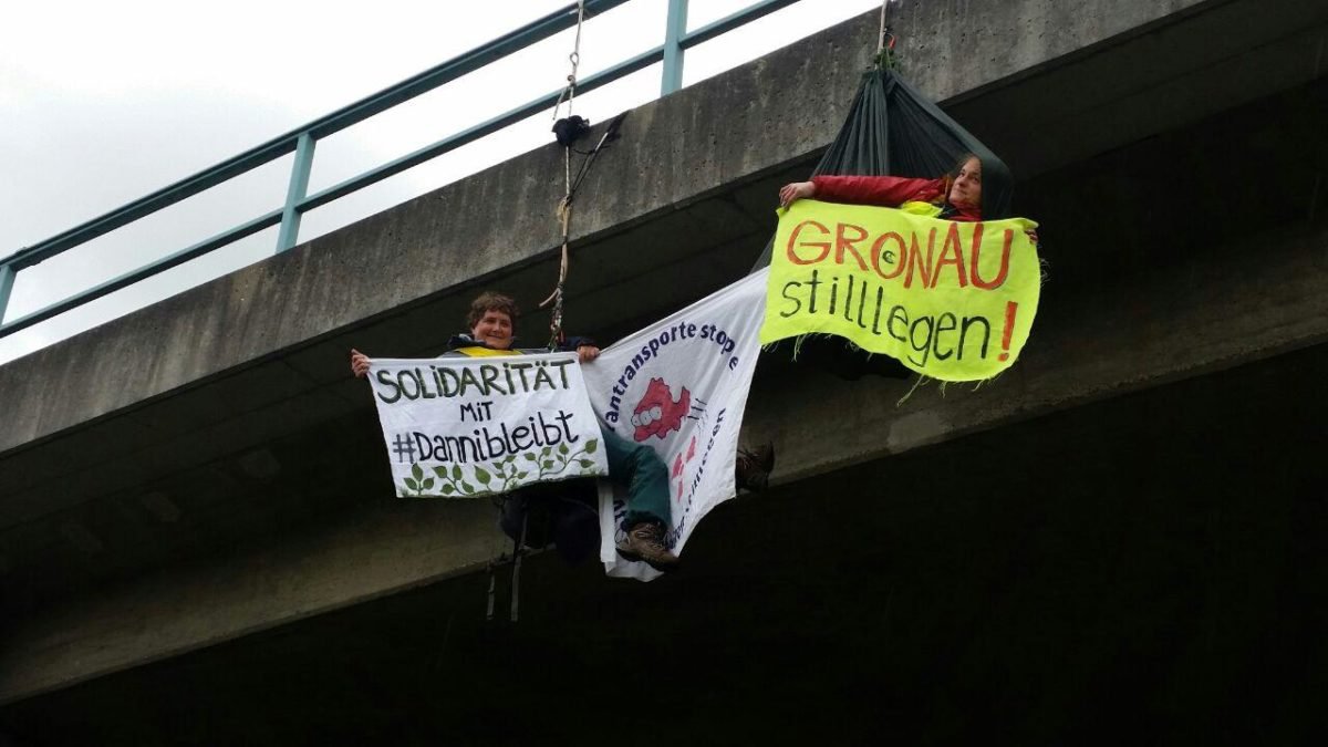 Mehr als 5 Stunden Zwangspause musste der Zug, beladen mit hunderten Tonnen abgereichertem Uranhexafluorid, vor einer Autobahnbrücke bei Münster einlegen. Höhenretter der Polizei räumten mithilfe eines Hubwagens die beiden Aktivistinnen, die sich abgeseilt hatten. Erst gegen 17.00 Uhr konnte der Zug seine Fahrt fortsetzen.