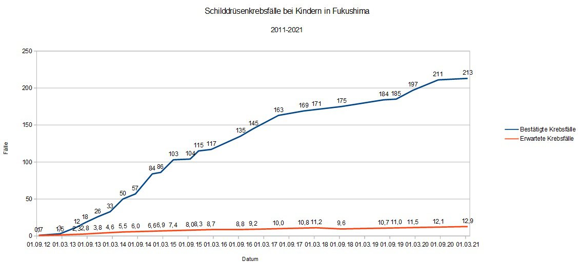 Die offizielle Neuerkrankungsrate von Schilddrüsenkrebs in Japan für Menschen unter 25 beträgt 0,59 Fälle pro 100.000 Personen und Jahr. Das bedeutet, dass unter den 218.000 Kindern aus Fukushima etwa 1,3 neue Schilddrüsenkrebsfälle pro Jahr zu erwarten wären, über 10 Jahre also 13 Fälle. Tatsächlich diagnostiziert wurden aber 213. Auch wenn man lediglich die screeningeffekt-freie Zeit nach der Erstuntersuchung betrachtet, ist die Zahl von 112 tatsächlich diagnostizierten Schilddrüsenkrebsfällen 20 mal höher als die 5,5 normalerweise zu erwartenden Fälle. Japans größte Schilddrüsenklinik in Tokio verzeichnete hingegen keine derartige Steigerung der Schilddrüsenkrebszahlen – ein Hinweis darauf, dass die Ursache dafür tatsächlich in Fukushima selbst zu suchen ist.
