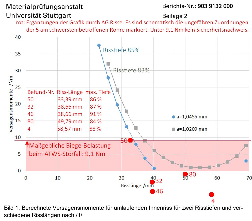Das Ergebnis der MPA-Berechnung ist im abgebildeten Schaubild zu erkennen: Demnach sinkt bei derart rissgeschädigten Rohren schon ab einer Risslänge von 34 bzw. 38 Millimeter die Tragfähigkeit unter die entscheidende Schwelle von 9,1 Newton-Metern (Nm) ab. Das ist die Belastung, mit der nach Aussage von EnBW und TÜV bei einem Störfall zu rechnen ist. (In der Grafik ist sie als rote waagrechte Linie eingezeichnet.) Demnach ist für mindestens vier, wenn nicht gar fünf Riss-Rohre aus Neckarwestheim – in der Grafik in Rot eingetragen – ein Versagen im Störfall nicht sicher auszuschließen; der gesetzlich geforderte Tragfähigkeitsnachweis kann so nicht erbracht werden. Das Ministerium hat auf Nachfrage von .ausgestrahlt mehrfach bestätigt, dass es diese KTA-Regel 3206 für maßgeblich hält und auch keine andere offiziell anerkannte alternative Methode genannt, nach der es den Nachweis führen will.