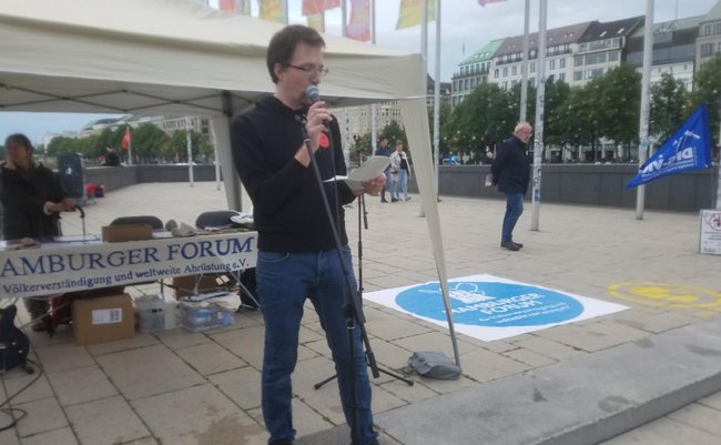Das Hamburger Friedensforum veranstaltete am 6. August - dem Jahrestag des Angriffes auf Hiroshima - in Hamburg eine Gedenkkundgebung anlässlich der Atombombenabwürfe auf Hiroshima und Nagasaki. .ausgestrahlt hat in einem Redebeitrag dargestellt, wie die militärische und die zivile Nutzung der Atomkraft zusammenhängen und warum Atomkraft die Klimakrise verschlimmert.