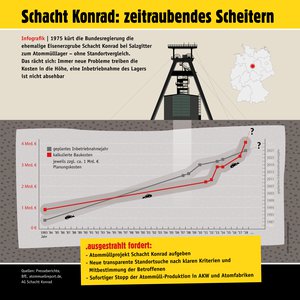 Schacht Konrad ist wie das gescheiterte Atommülllager Gorleben ein Atomprojekt der 70er Jahre. Damals ging es vor allem um einen „Entsorgungsnachweis“ für den Bau und Betrieb von Atomkraftwerken. Laut Schätzung der Bundesregierung würde der weitere Umbau des Erzbergwerkes weitere 1,77 Mrd. Euro verschlingen, Mittel, die dem öffentlich-rechtlichen Entsorgungsfonds entzogen werden. Weil Konrad genau wie Gorleben nicht Ergebnis eines offenen, transparenten Standortauswahlprozesses gewesen, wissenschaftlich ungeeignet und damit politisch kaum durchsetzbar sein wird, versenkt die Bundesregierung hier weiter „sinnlos“ Steuergelder, mahnt die AG an. „Deshalb fordern wir einen sofortigen Baustopp! Die Grüne Bundesumweltministerin Steffi Lemke darf nicht die Fehler ihrer Vorgänger*innen wiederholen, die alle Probleme ausgesessen haben. Die laufende Endlagersuche muss für eine Alternative zu Schacht Konrad geöffnet werden. Ein Schwarzbau wie in Gorleben darf sich nicht wiederholen.“