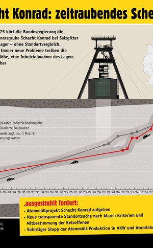 Unter dem Slogan „Nach Gorleben auch Schacht Konrad aufgeben!" fordern inzwischen 78 Umweltverbände und Anti-Atom-Initiativen aus ganz Deutschland die sofortige Aufgabe des Projektes Schacht Konrad. Für alle Arten radioaktiver Abfälle muss ein vergleichendes und transparentes Standortauswahlverfahren umgesetzt werden, heißt es in der Resolution, die im Rahmen der Atommüllkonferenz beschlossen wurde.