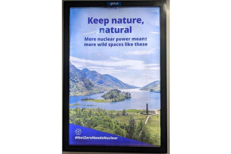 Auf dem Plakat sind in den Himmel über dem See die Worte geschrieben: „Bewahrt die Natur: Mehr Atomkraft bedeutet mehr Naturschauplätze wie dieser“. Am unteren Rand steht ein Hashtag – #NetZeroNeedsNuclear – ohne weitere Hinweise darauf, wer hinter dieser Werbung stecken könnte.
