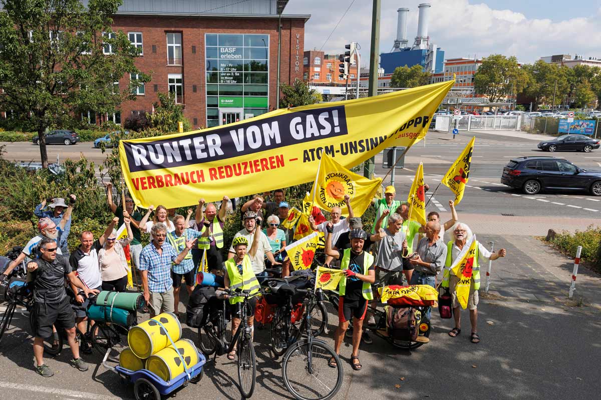 Auf der 3. Etappe der Anti-Atom-Radtour im Süden protestieren die Mitradler*innen bei BASF in Ludwigshafen. Denn Atomkraft hilft nicht gegen die Gaskrise.