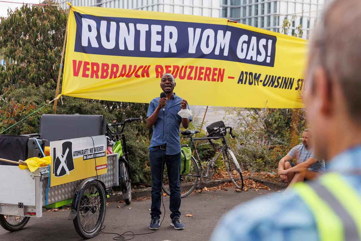 Anti-Atom-Radtour 2022 macht Stopp beim Gas-Großverbraucher BASF in Ludwigshafen, den Atomkraft hilft nicht gegen Gaskrise – Gas sparen hingegen schon. Darüber hinaus erinnern die Demonstrierenden an das Massaker von Marikana (Südafrika), bei dem am 16. August 2012 bei einem Streik beim südafrikanischen BASF-Zulieferer Lonmin 34 Bergleute erschossen worden waren.