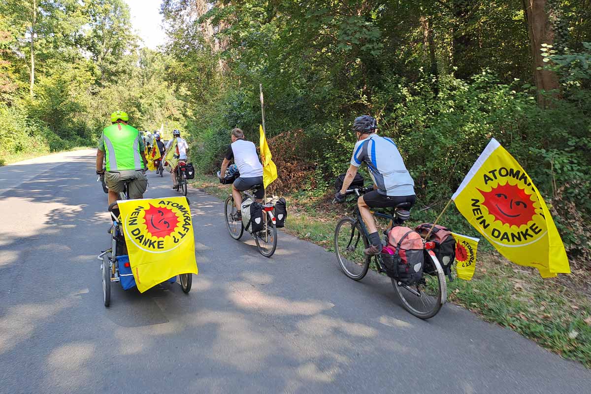14.8.22: Vom 13. August bis 4. September führt die Südtour in 20 Etappen nach Freiburg. Die 1. Etappe verläuft vom Ort des ersten deutschen AKW über Karlstein/Main und das Plutonium-Dorf Hanau. - Anti-Atom-Radtour: Von Hitzacker über Dannenberg nach Gorleben