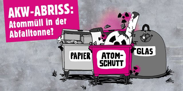 Illustration "AKW-ABriss: Atommüll in der Abfalltonne". Zwei graue Müllcontainer mit der Aufschrift "Papier" und "Glas", davor ein pinkfarbener mit der Aufschrift "Atomschutt"