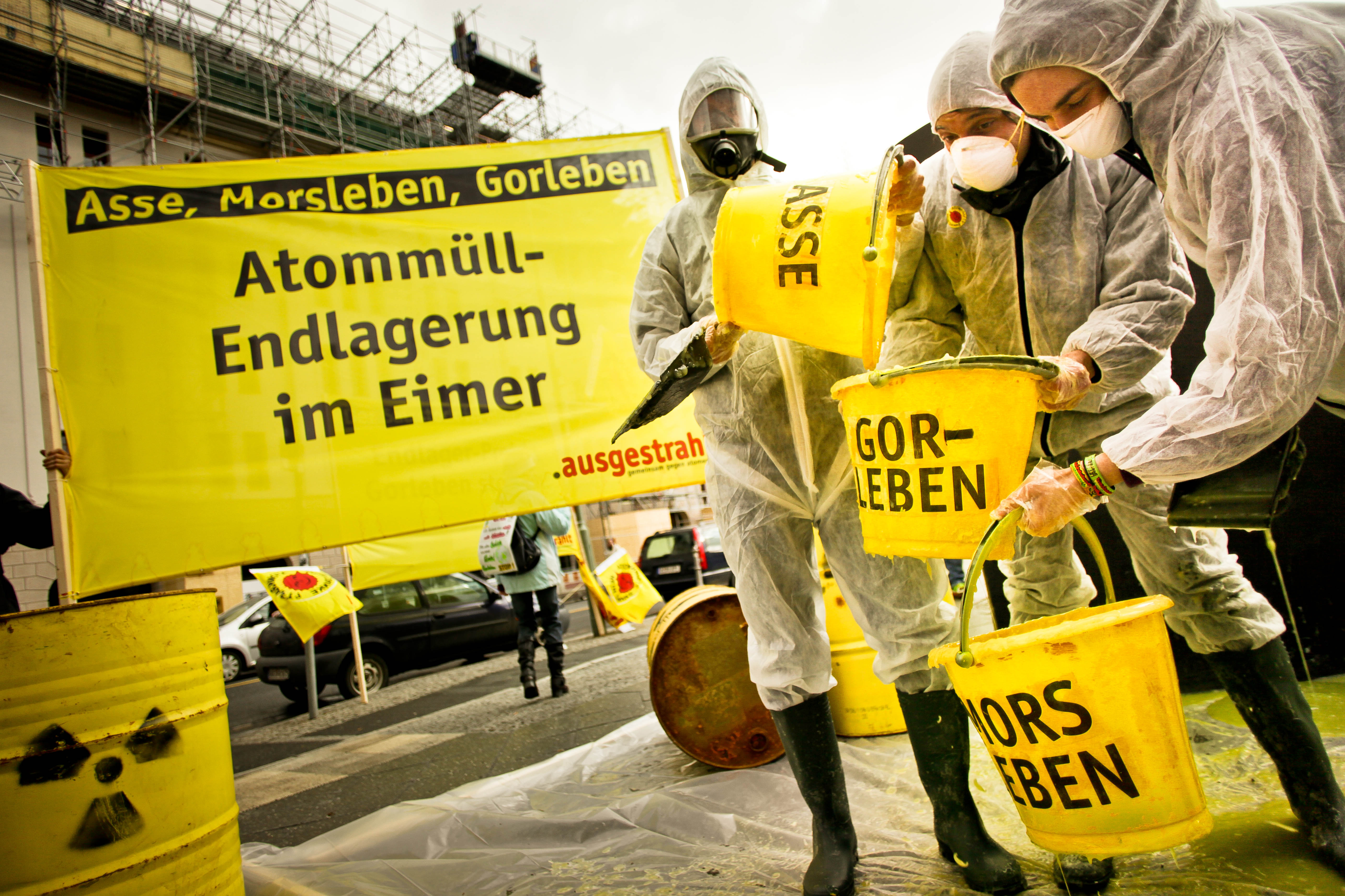 Atomkraftgegner*innen machen 2011 vor dem Tagungshotel der Umweltminister*innen aus Bund und Ländern in Dessau auf die ungelöste Atommüll-Entsorgung aufmerksam. Die Forderung: Das Ende des Endlager-Projekts im dafür völlig ungeeigneten Salzstock Gorleben.