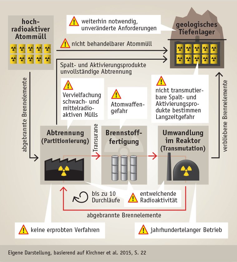 - Selbst wenn das Konzept technisch umsetzbar wäre, bräuchte es weiterhin eine langfristige Lagerung des Atommülls. Die besonders gefährlichen langlebigen Spalt- und Aktivierungsprodukte sowie bestimmte Abfallarten lassen sich mit den aktuell diskutierten Konzepten grundsätzlich nicht behandeln. Im Gegenteil: Die Menge an Spaltprodukten würde durch eine Umwandlung noch zunehmen.