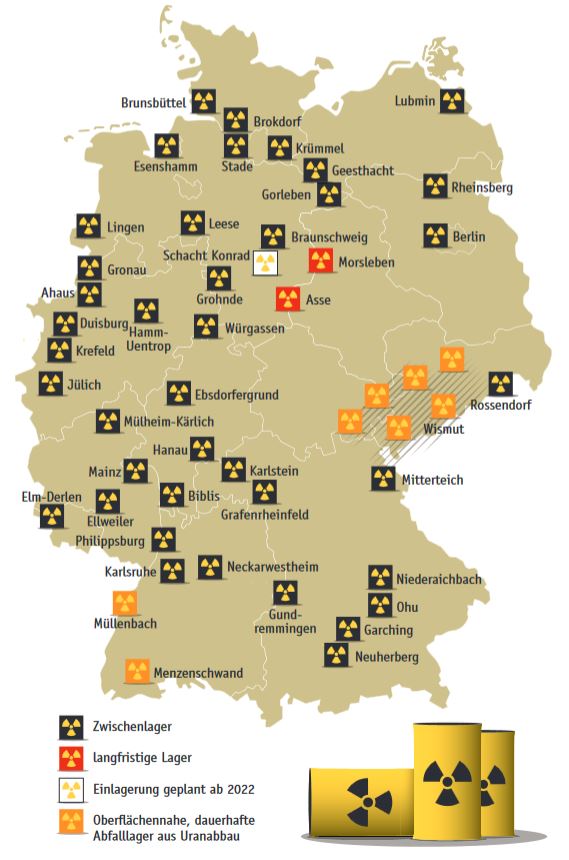 Beim Betrieb von Atomkraftwerken entsteht weltweit täglich hochgiftiger, radioaktiver Abfall, der mehr als eine Million Jahre sicher verwahrt werden muss. Ebenfalls wird Atommüll bei der Herstellung des für AKW nötigen Brennstoffes erzeugt In Deutschland findet das in den Atomfabriken in Gronau und Lingen statt. Beim Abriss der abgeschalteten AKW fallen zusätzlich große Mengen an kontaminiertem Bauschutt an. Dazu kommen radioaktive Abfälle aus Medizin und Forschung. Tatsächlich ist noch kein einziges Gramm davon schadlos „entsorgt“.