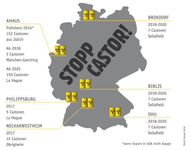Umweltministerin Barbara Hendricks (SPD) hat nun vier Standorte benannt; selbst das bis zuletzt störrische Bayern hat zugestimmt. Die fünf Behälter aus La Hague sollen demnach voraussichtlich 2017 im badischen Philippsburg abgestellt werden. Von 2018 bis 2020 ist jährlich ein Transport von sieben Castoren mit hochradioaktiven Glaskokillen aus Sellafield geplant: nach Brokdorf (Schleswig-Holstein), Biblis (Hessen) und Ohu (Bayern), wobei die Reihenfolge noch nicht feststeht.