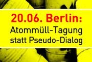 Berlin, 20. Juni 2015: Erst demonstrierten die BI Lüchow-Dannenberg und .ausgestrahlt vor dem Veranstaltungsort des sogenannten „Bürgerdialogs“ der Atommüll-Kommission gegen die fehlende Ernsthaftigkeit in der Bürgerbeteiligung. Danach fand die selbstorganisierte Tagung „Atommüll ohne Ende“ statt.