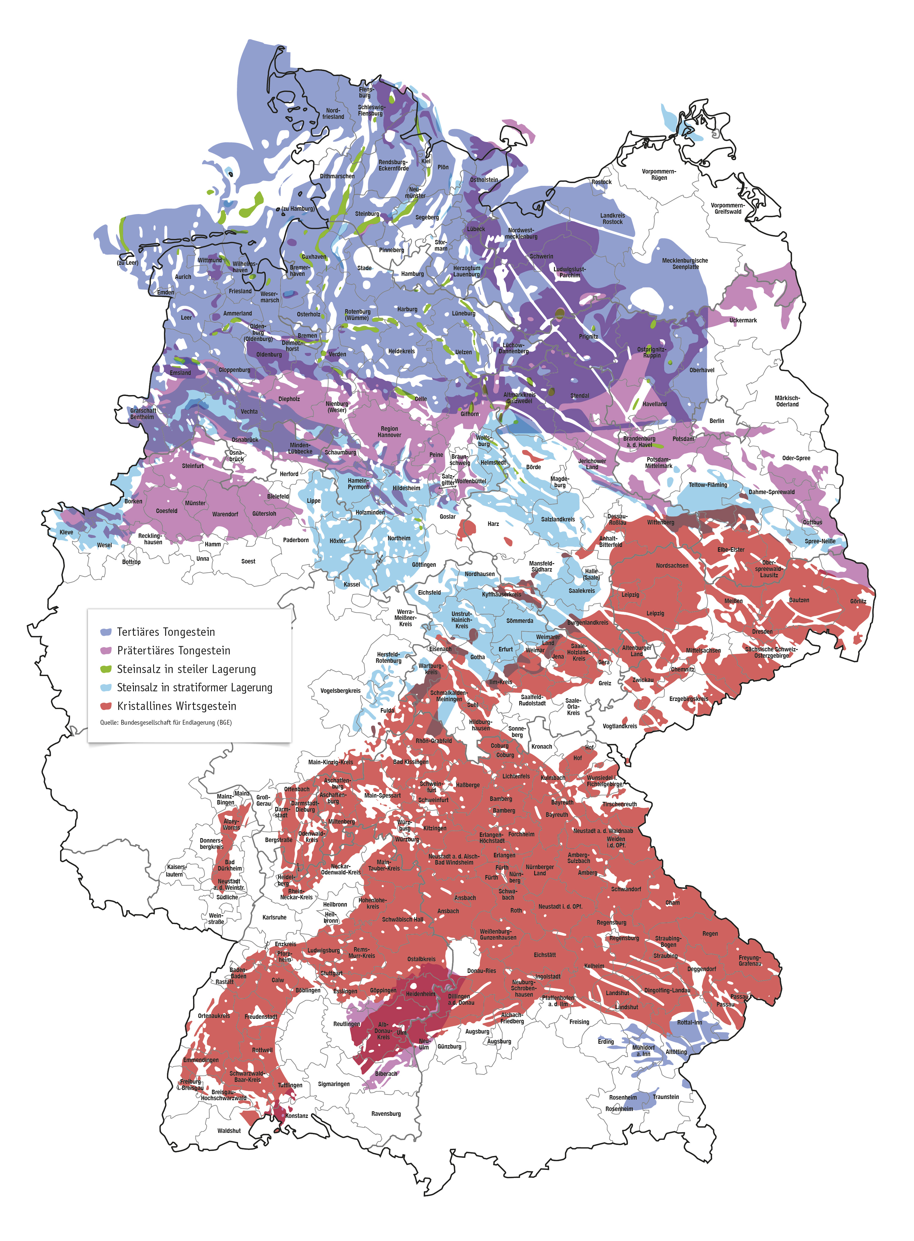 Die „Bundesgesellschaft für Endlagerung“ (BGE) hat am 28. September 2020 eine Landkarte veröffentlicht, auf der die Gebiete zu sehen sind, die aus ihrer Sicht „günstige geologische Voraussetzungen für die sichere Endlagerung radioaktiver Abfälle erwarten lassen.“ In diesen sogenannten "Teilgebieten" wird die nächsten Jahre nach einem Endlager-Standort gesucht.