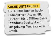 Doch so oder so: Hochradioaktiver Abfall aus Atomkraftwerken und aus der Plutonium-Abspaltung lagert in Deutschland an 16 Orten in Castor-Behältern in sogenannten Zwischenlagern. Niemand weiß bisher, wie und wo dieser Müll langfristig so aufbewahrt werden kann, dass er die kommenden Generationen möglichst wenig gefährdet.