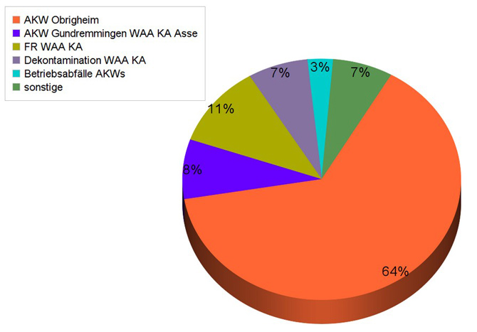 90 Prozent der gesamten Strahlung in der Asse (211.000 Curie) stammen aus der Wiederaufbereitungsanlage Karlsruhe (WAK). Somit kommen de facto 63 Prozent des radioaktiven Inventars in der Asse vom AKW Obrigheim, neun Prozent vom AKW Gundremmingen.
