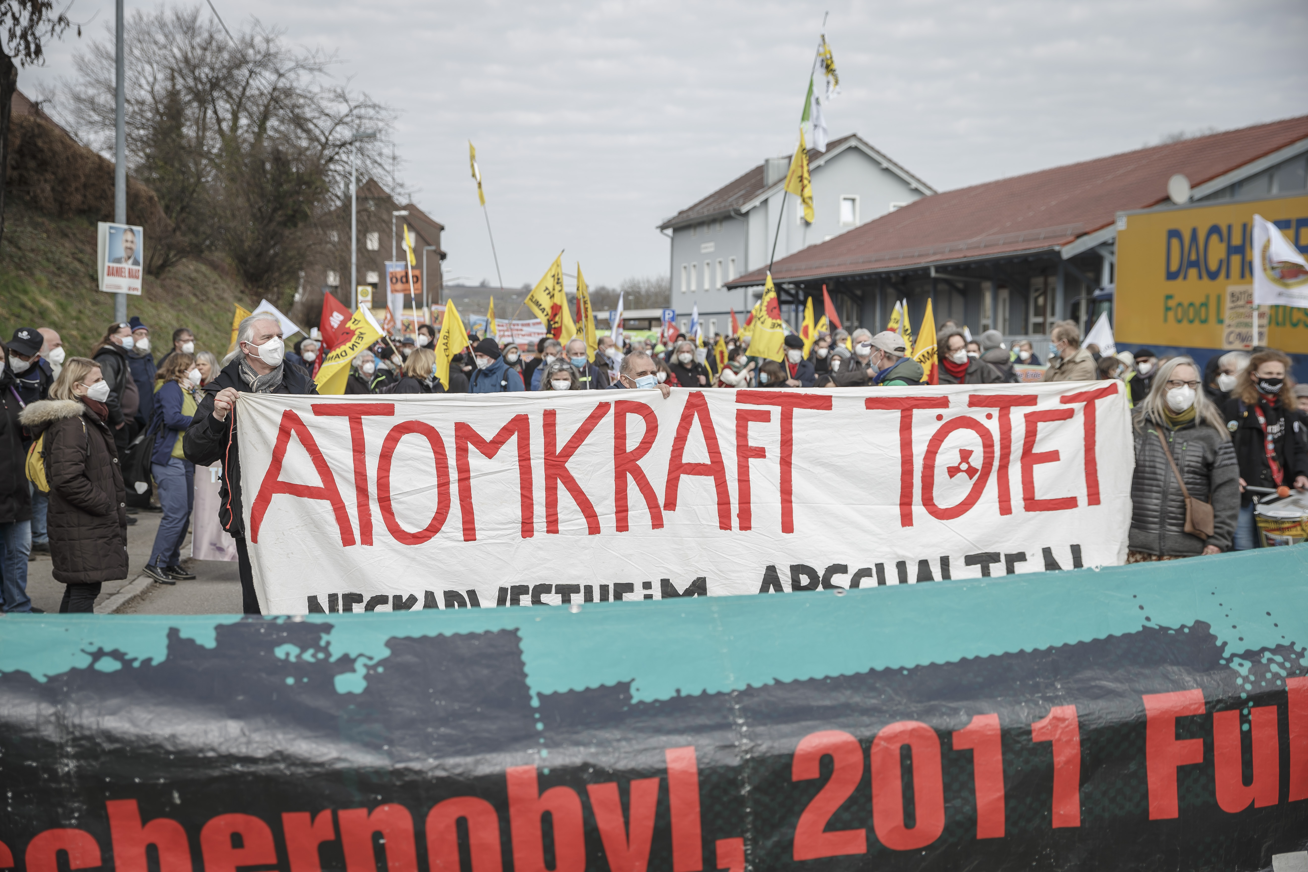 07.03.2021: Zehn Jahre nach dem Super-GAU im AKW Fukushima fordern 500 Atomkraftgegner*innen mit einer Demonstration zum AKW Neckarwestheim‑2 dessen sofortige Stilllegung. Auch in Fukushima waren die Gefahren lange bekannt, wurden aber ignoriert – bis es schließlich zur Katastrophe kam.
