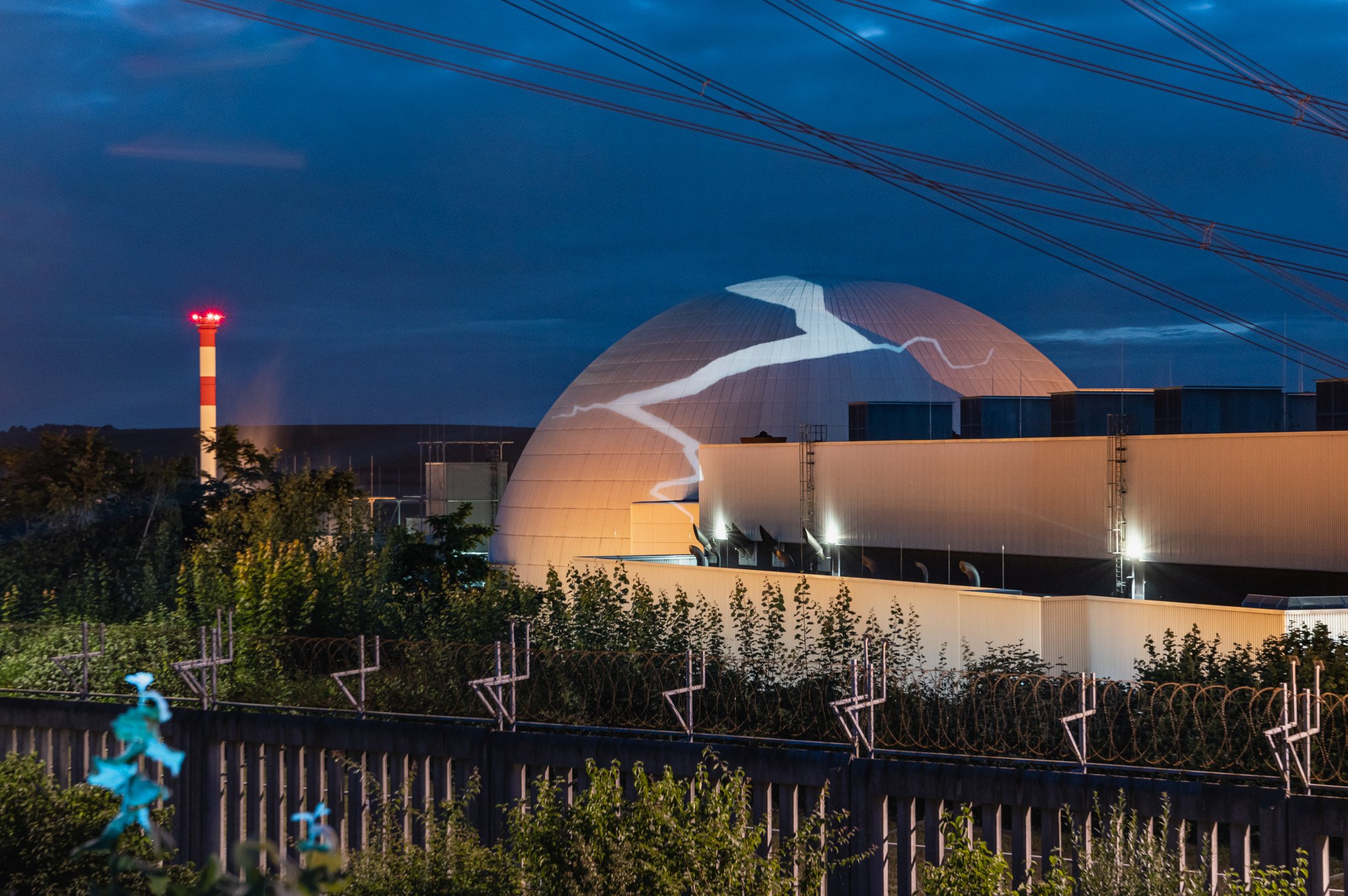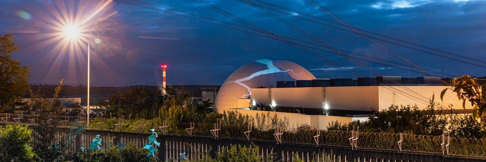 08.07.2020: In der Nacht zum 08. Juli 2020 projizierten Atomkraftgegner*innen einen großen Riss auf die Reaktorkuppel.