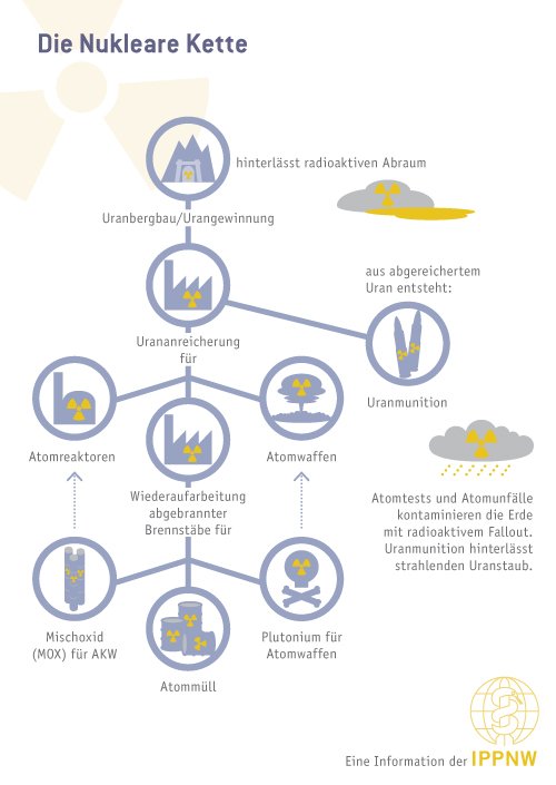 Noch immer ist die Option auf die Atombombe einer der bedeutendsten Gründe, warum Staaten auf die zivile Nutzung der "Kernenergie" setzen. Doch auch jenseits von Atomwaffen stellt Atomkraft eine Gefahr für den Frieden dar. Mit steigender Nachfrage wächst die Gefahr von militärischen Auseinandersetzungen um den immer knapper werdenden Rohstoff Uran. Ein Atomkraftwerk ist zudem ein risikoreiches Angriffsziel für Terroranschläge: Mit seinem radioaktiven Inventar birgt es wie kaum ein anderes Objekt das Potenzial, Millionen Menschen zu töten und ganze Regionen unbewohnbar zu machen. Und Munition aus abgereichertem Uran (depleated uranium, DU), einem Abfallprodukt der Urananreicherung, verursacht bei ihrem Einsatz zusätzliche Gesundheits- und Umweltschäden.