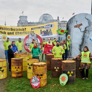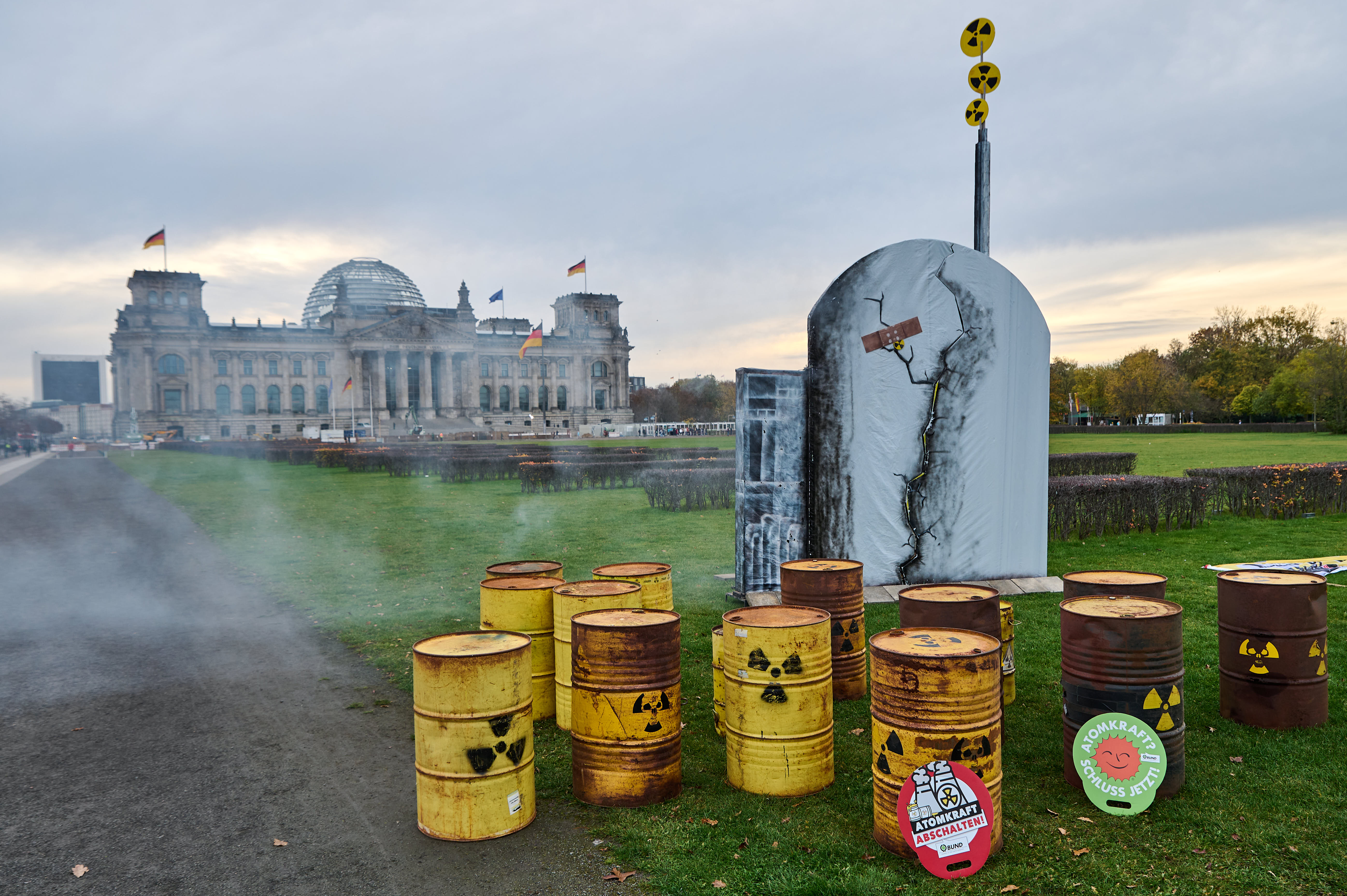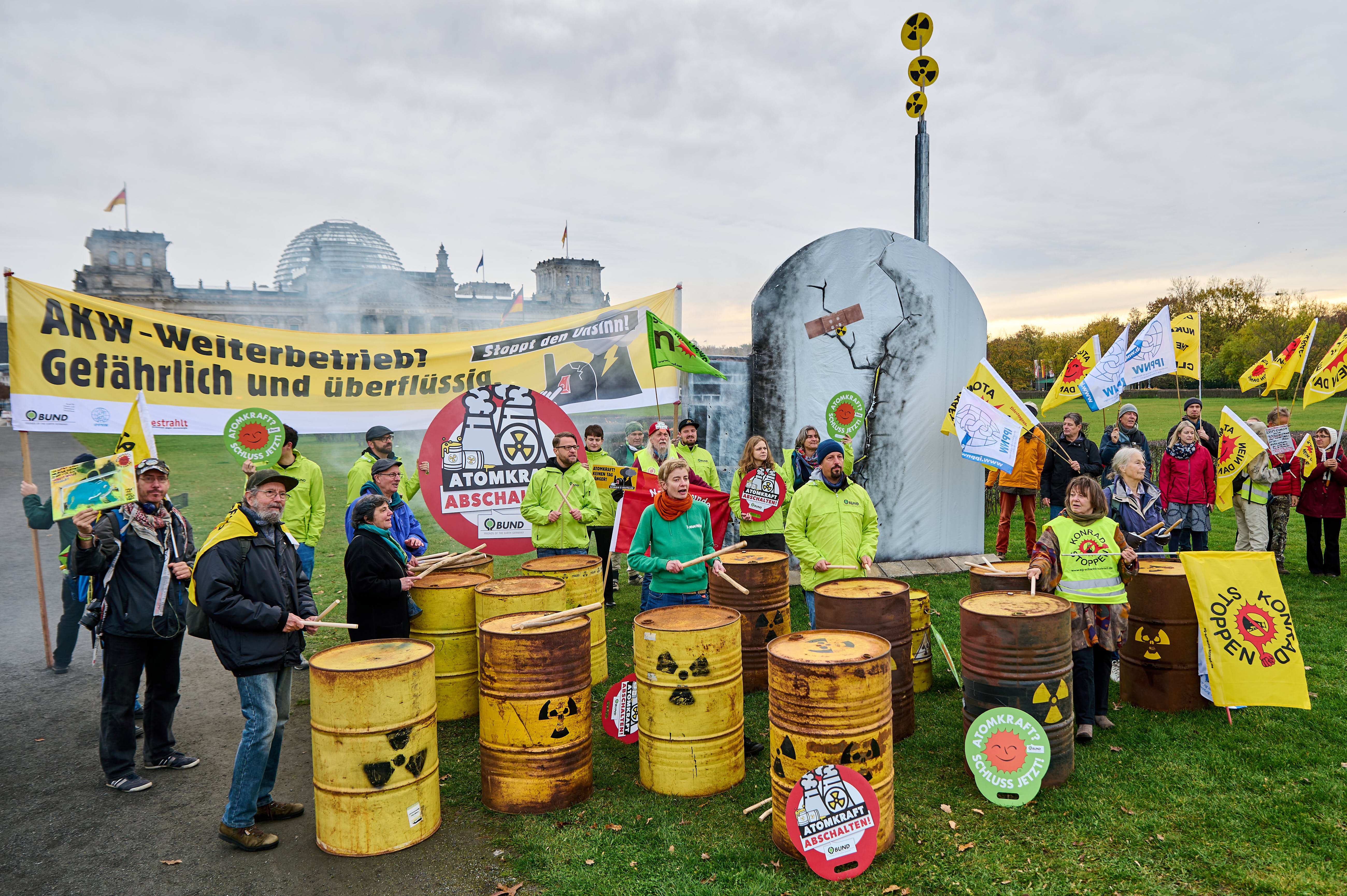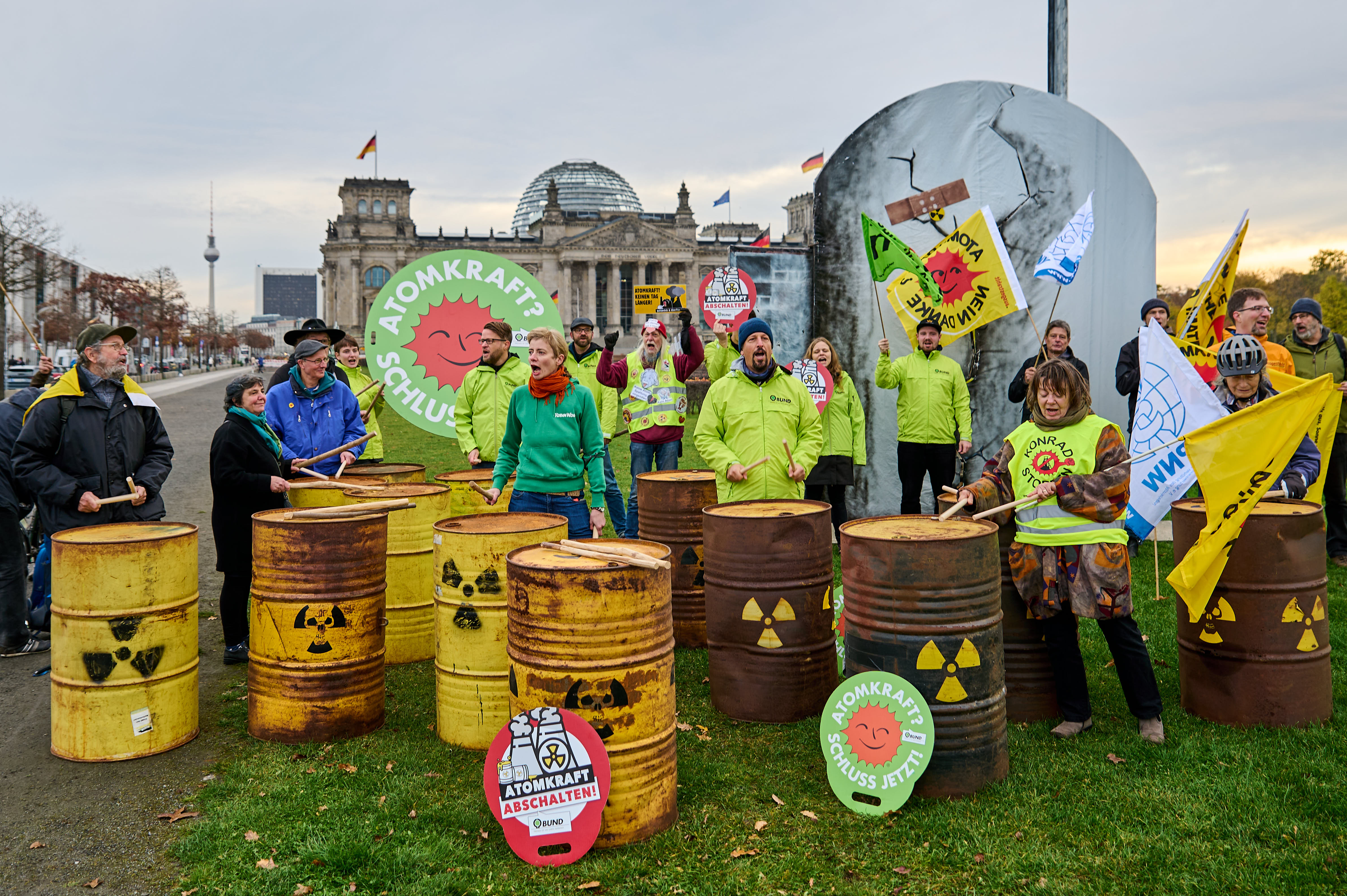 Am 11.11.2022 hat der Bundestag die Laufzeitverlängerung der drei letzten laufenden AKW beschlossen. In einer gemeinsamen Aktion von BUND, IPPNW und RobinWood haben wir am 11.11. vor dem Bundestag gezeigt, dass sich die Anti-Atom-Bewegung gegen jeden Weiterbetrieb der deutschen AKW wehrt.