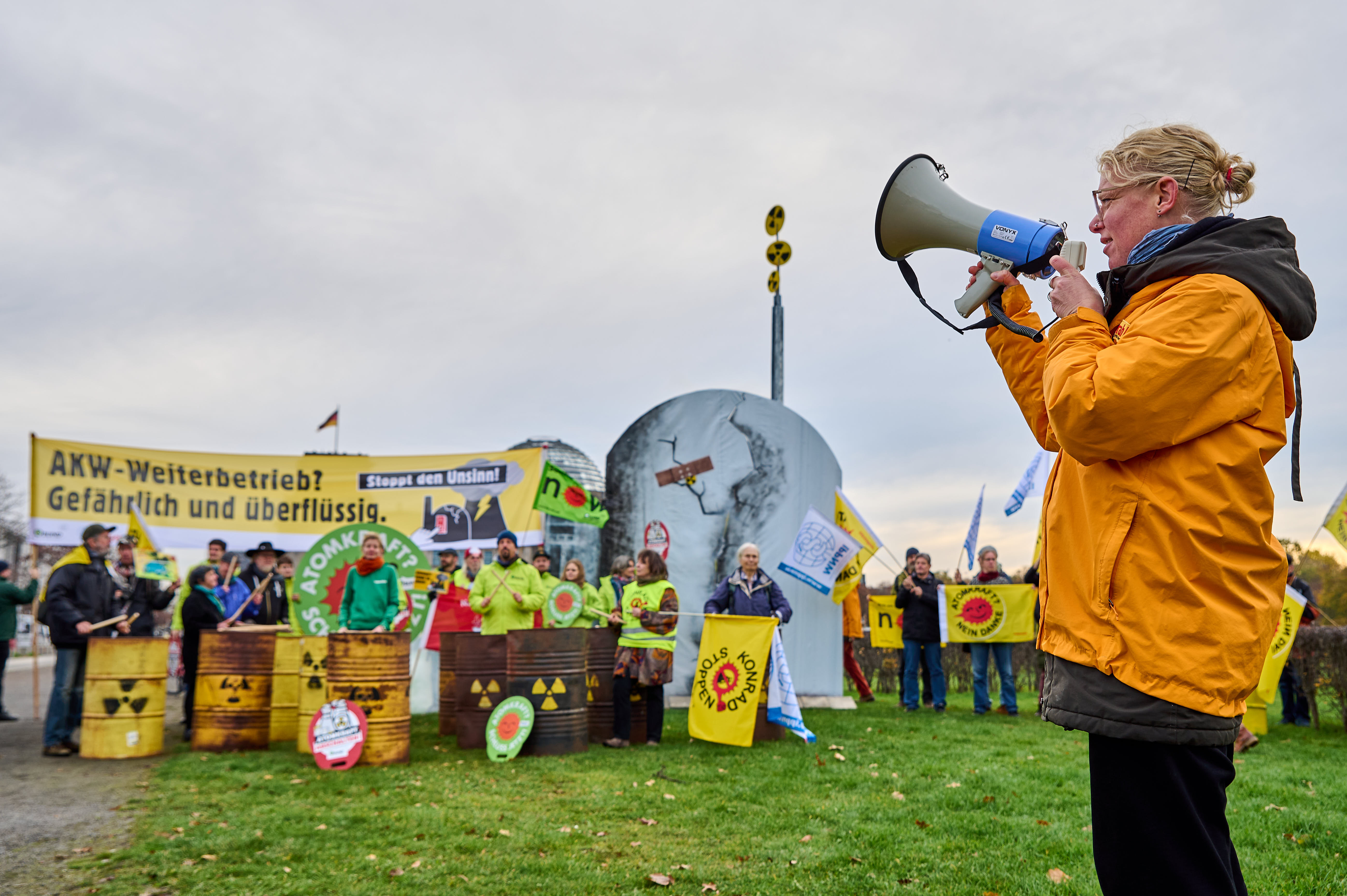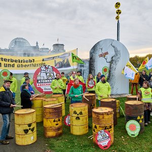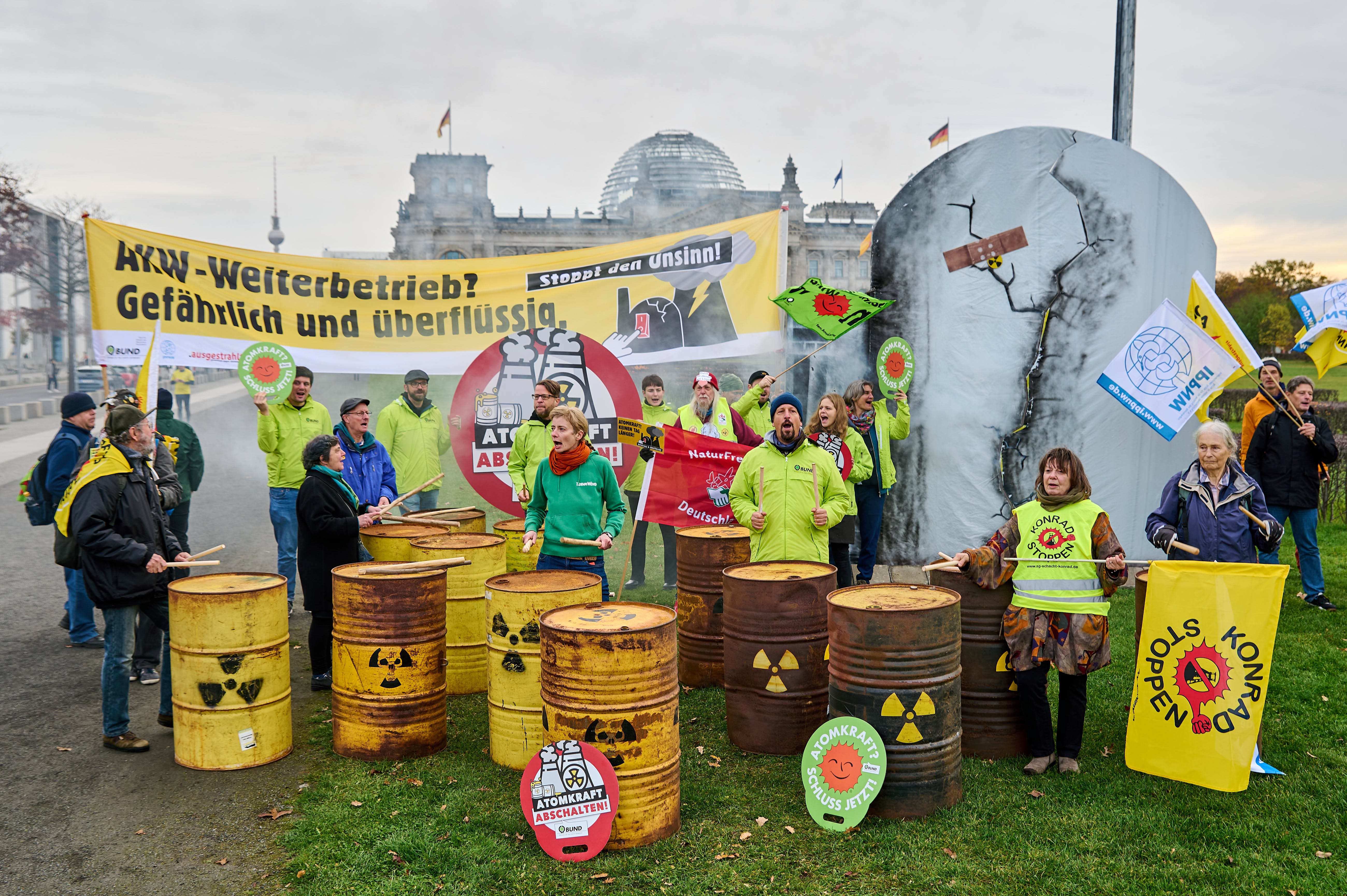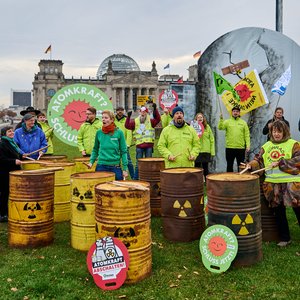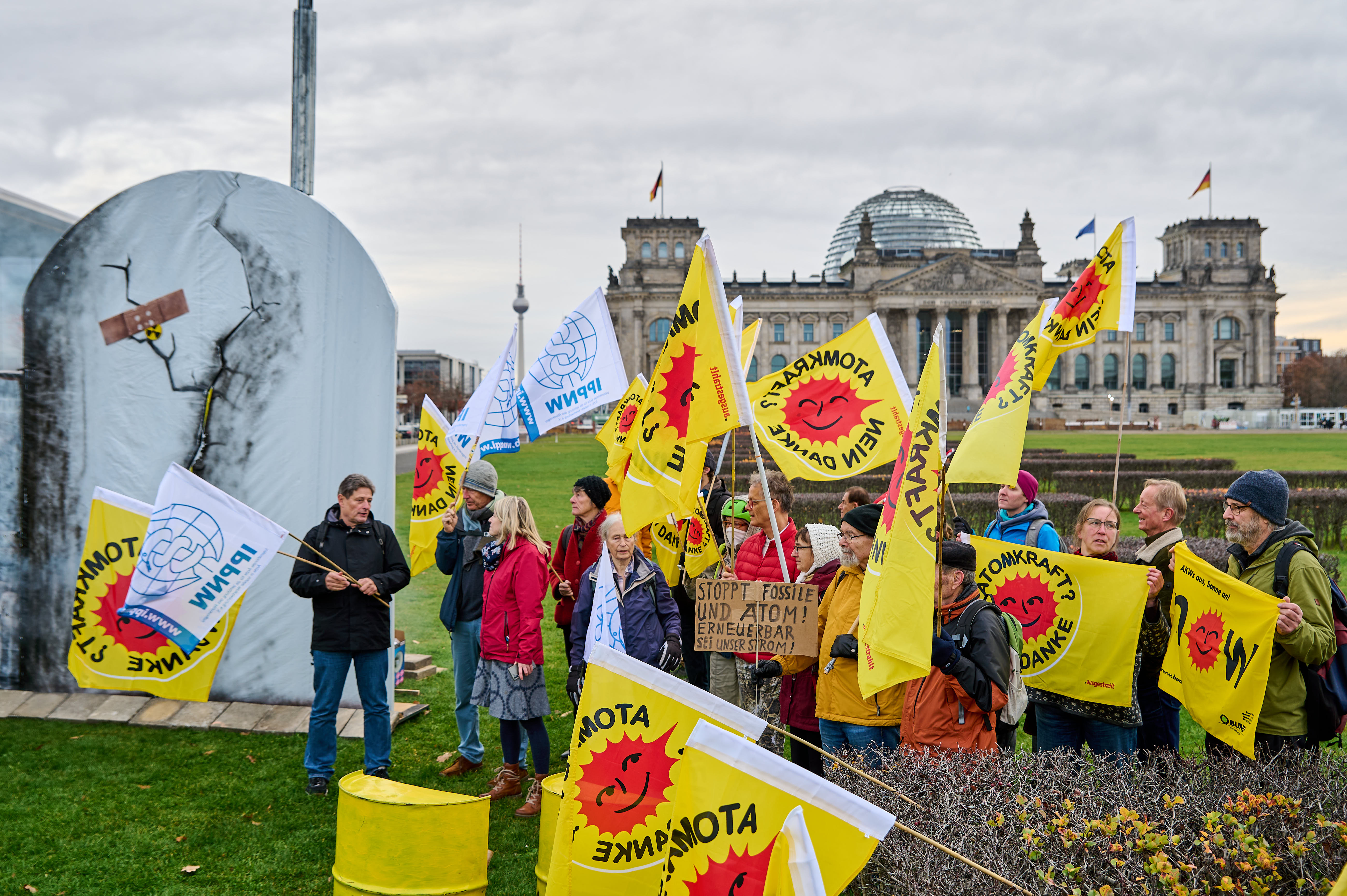 Am 11.11.2022 hat der Bundestag die Laufzeitverlängerung der drei letzten laufenden AKW beschlossen. In einer gemeinsamen Aktion von BUND, IPPNW und RobinWood haben wir am 11.11. vor dem Bundestag gezeigt, dass sich die Anti-Atom-Bewegung gegen jeden Weiterbetrieb der deutschen AKW wehrt.