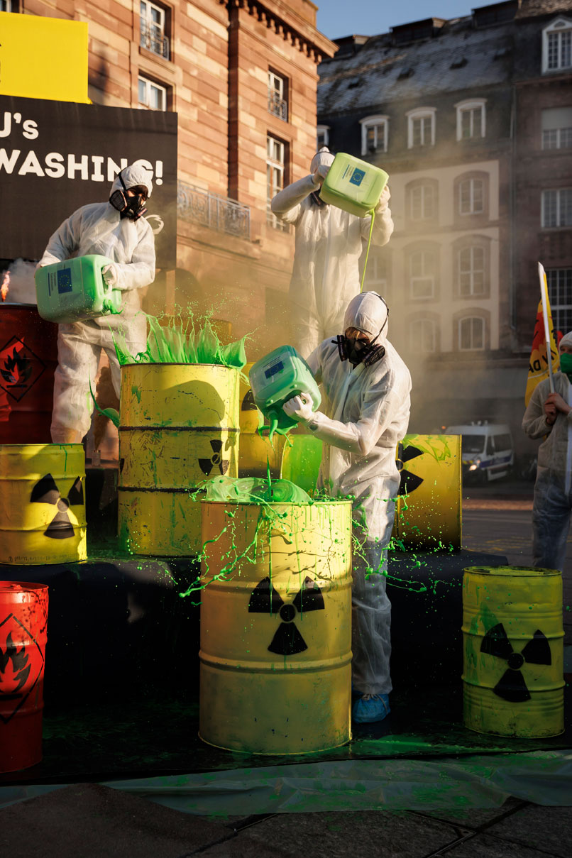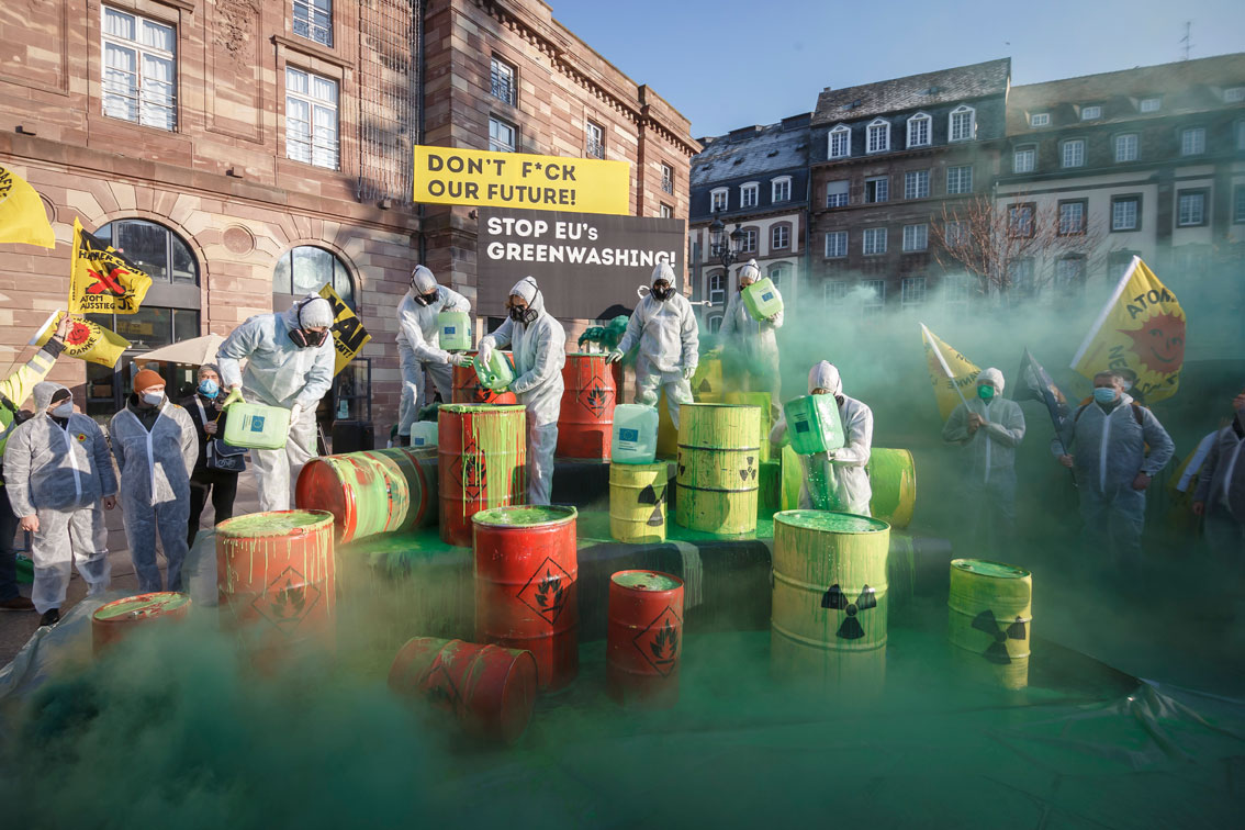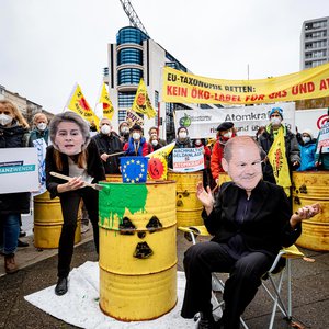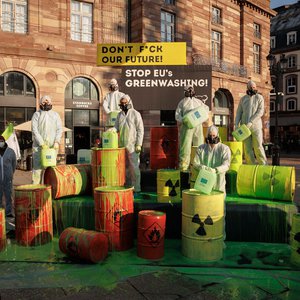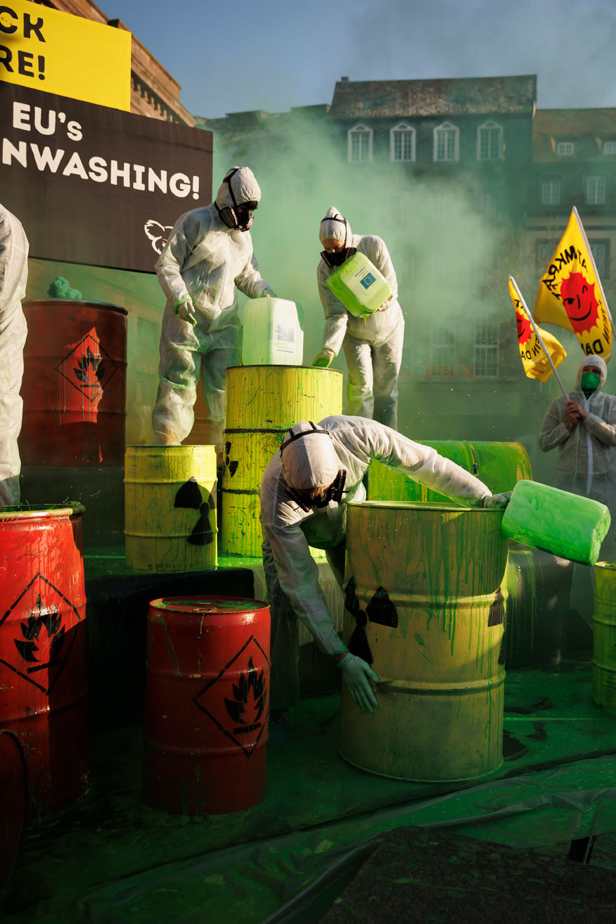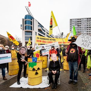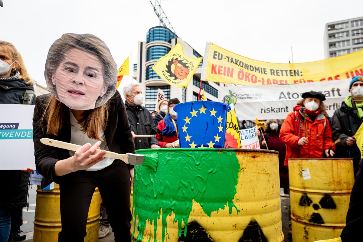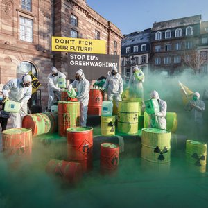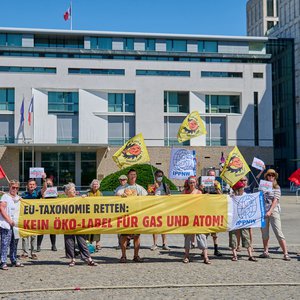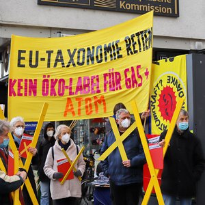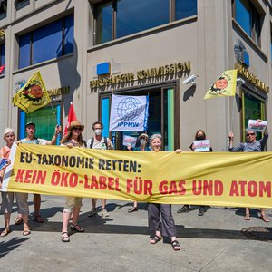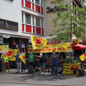 Protest vor EU-Vertretungen gegen Greenwashing von Atom und Erdgas