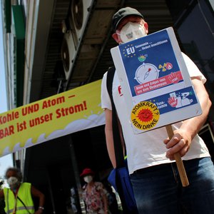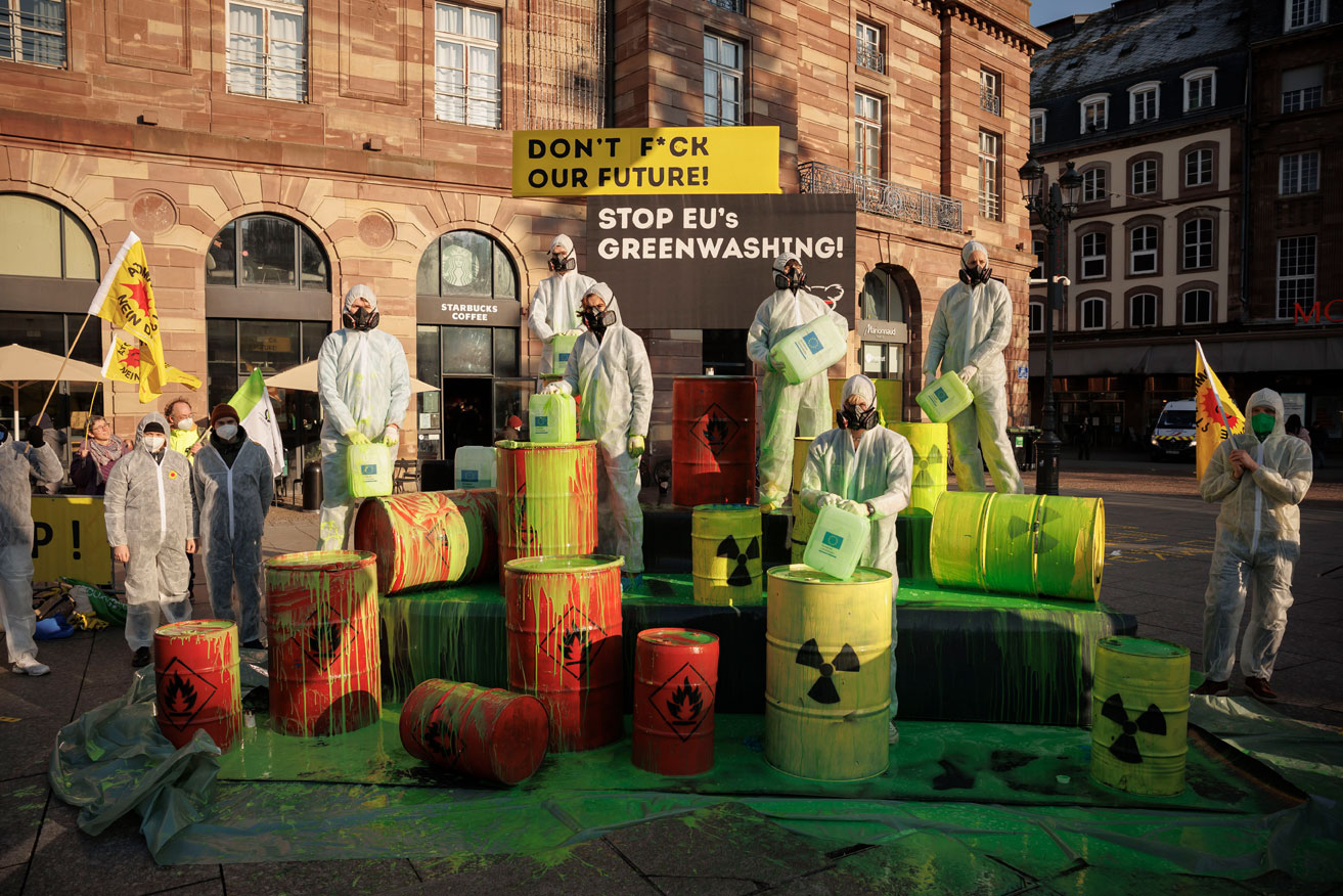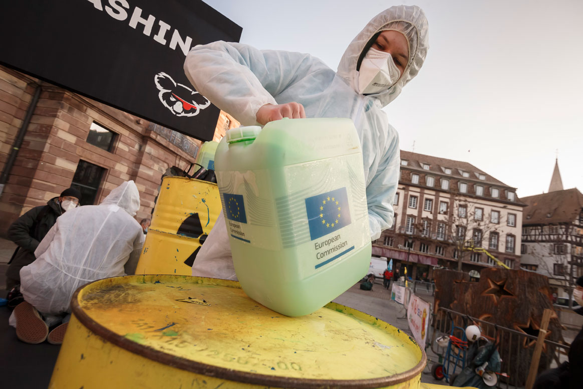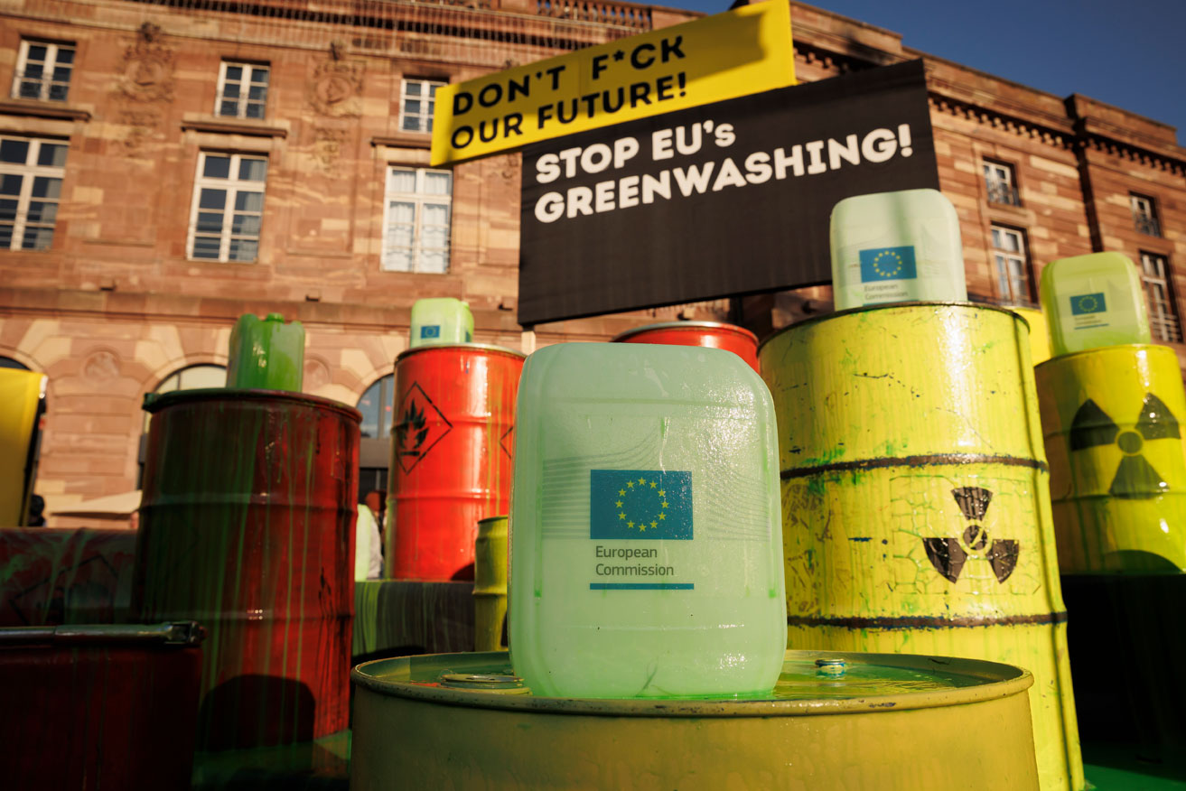Protest vor EU-Vertretungen gegen Greenwashing von Atom und Erdgas
