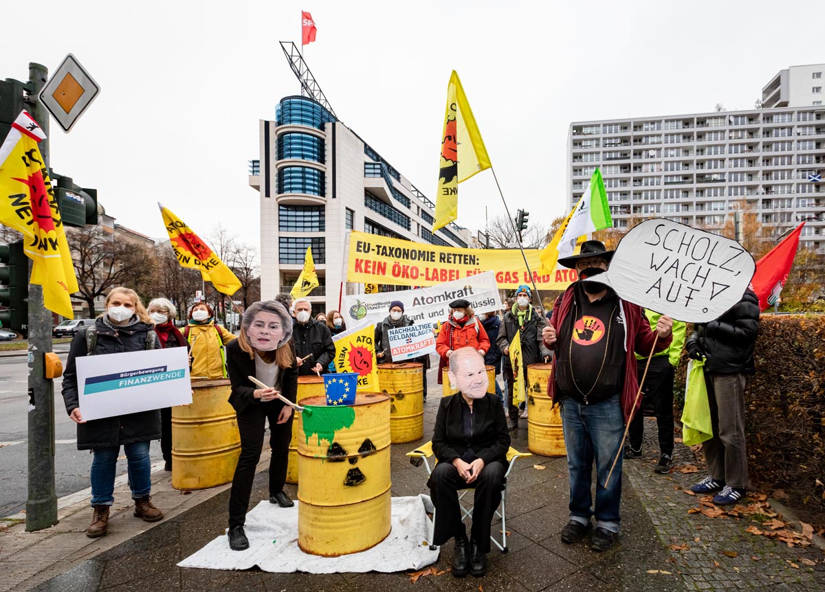 Zur für den 03.02.22 erwarteten Veröffentlichung des Delegierten Rechtsaktes zur Aufnahme von Atomkraft und Erdgas in die EU-Taxonomie durch die EU-Kommission haben Anti-Atom- und Klimaschutz-Aktivisten zu Protesten vor allen drei Vertretungen der EU-Kommission in Deutschland – Berlin, Bonn und München – aufgerufen.