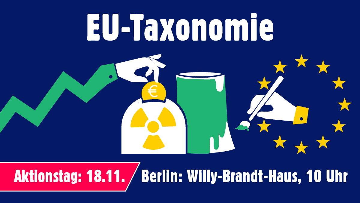 Eine Taxonomie, die Erdgas und Atomkraft als „grün“ deklariert, lenkt Finanzströme in veraltete und gefährliche Technologien. Dieses Geld fehlt dann für den Ausbau der erneuerbaren Energien und für wirklichen Klimaschutz.