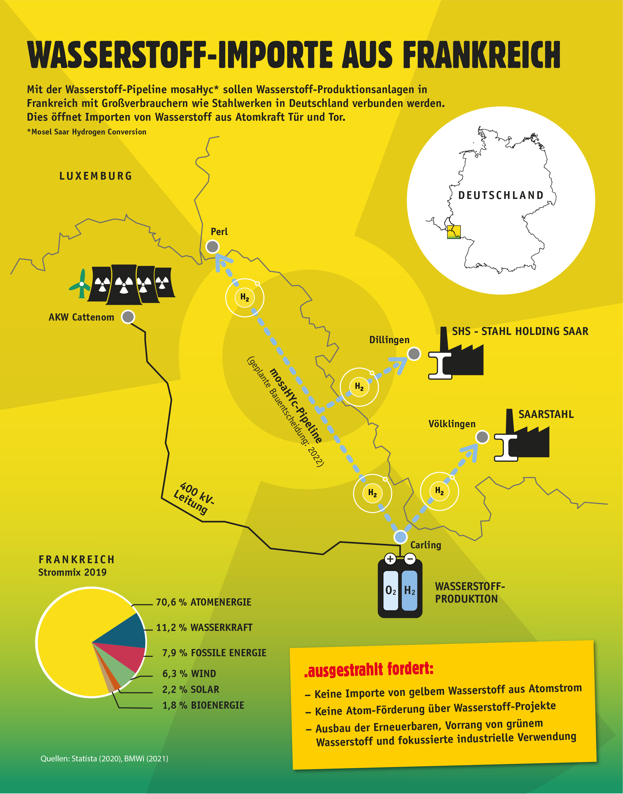 Mit der geplanten Wasserstoff-Pipeline mosaHyc* sollen Wasserstoff-Produktionsanlagen in Frankreich mit Großverbrauchern wie Stahlwerken in Deutschland verbunden werden. Dies öffnet Importen von Wasserstoff aus Atomkraft Tür und Tor.