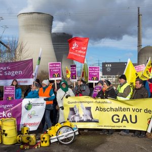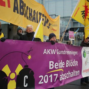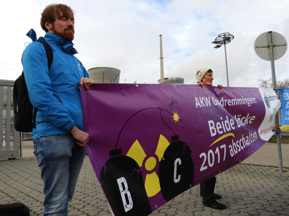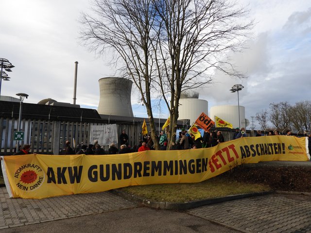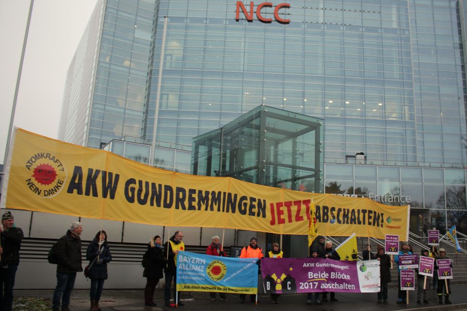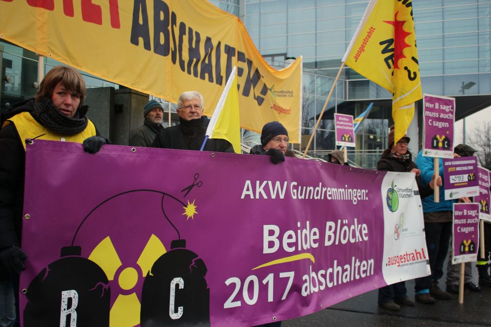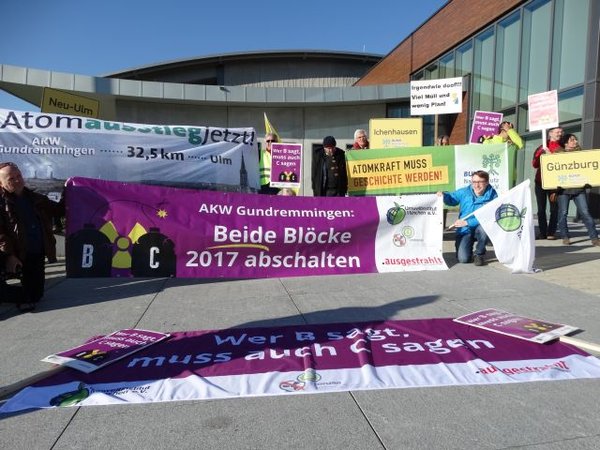 28. März 2017: Zum Erörterungstermin für das Verfahren zum Abriss des bayerischen AKW Gundremmingen unterstreicht .ausgestrahlt zusammen mit Bündnispartnern und Atomkraftgegner*innen die Forderung: BEIDE Blöcke müssen Ende des Jahres vom Netz gehen.