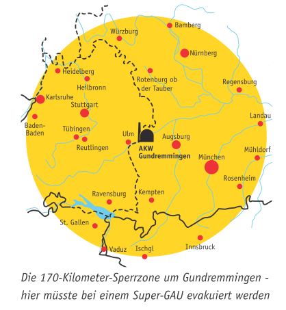 Ein Super-GAU in Gundremmingen würde das Aus für die Region bedeuten. Selbst nach optimistischen Szenarien, die das Bundesamt für Strahlenschutz einmal durchgerechnet hat, müsste ganz Süddeutschland mit Evakuierungen und dauerhaften Umsiedlungen rechnen.